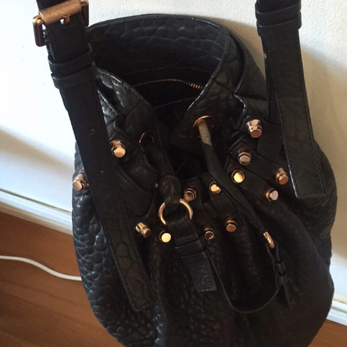 Säljer min superfina Alexander wang väska, modell Diego (stor modell) med nitar i roséguld. På det lilla handtaget har lite av lädret gått upp (går att fixa hos skräddare) - se bild 3. I övrigt i jättefint skick!