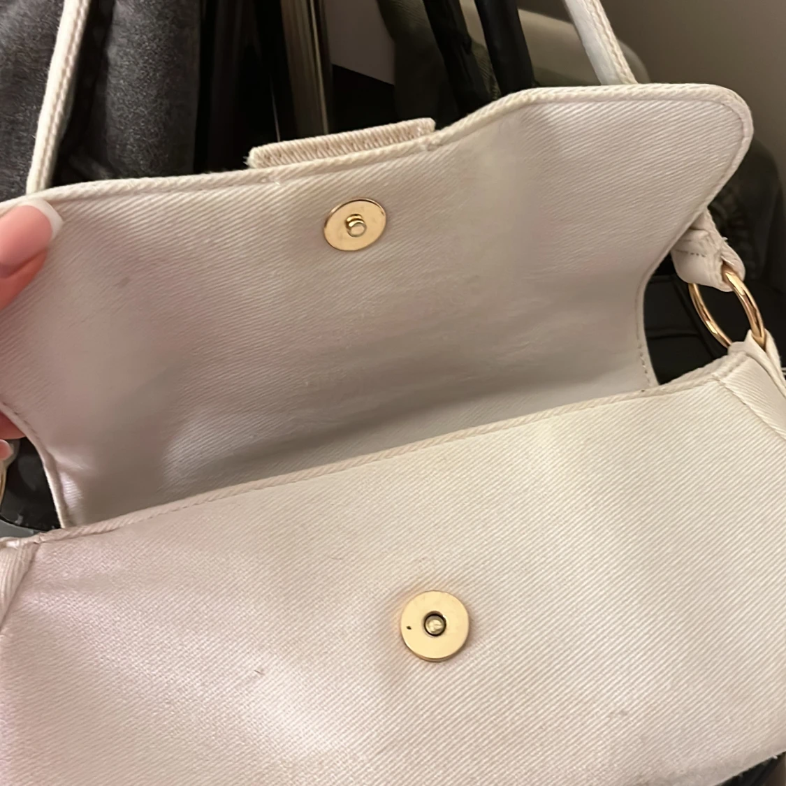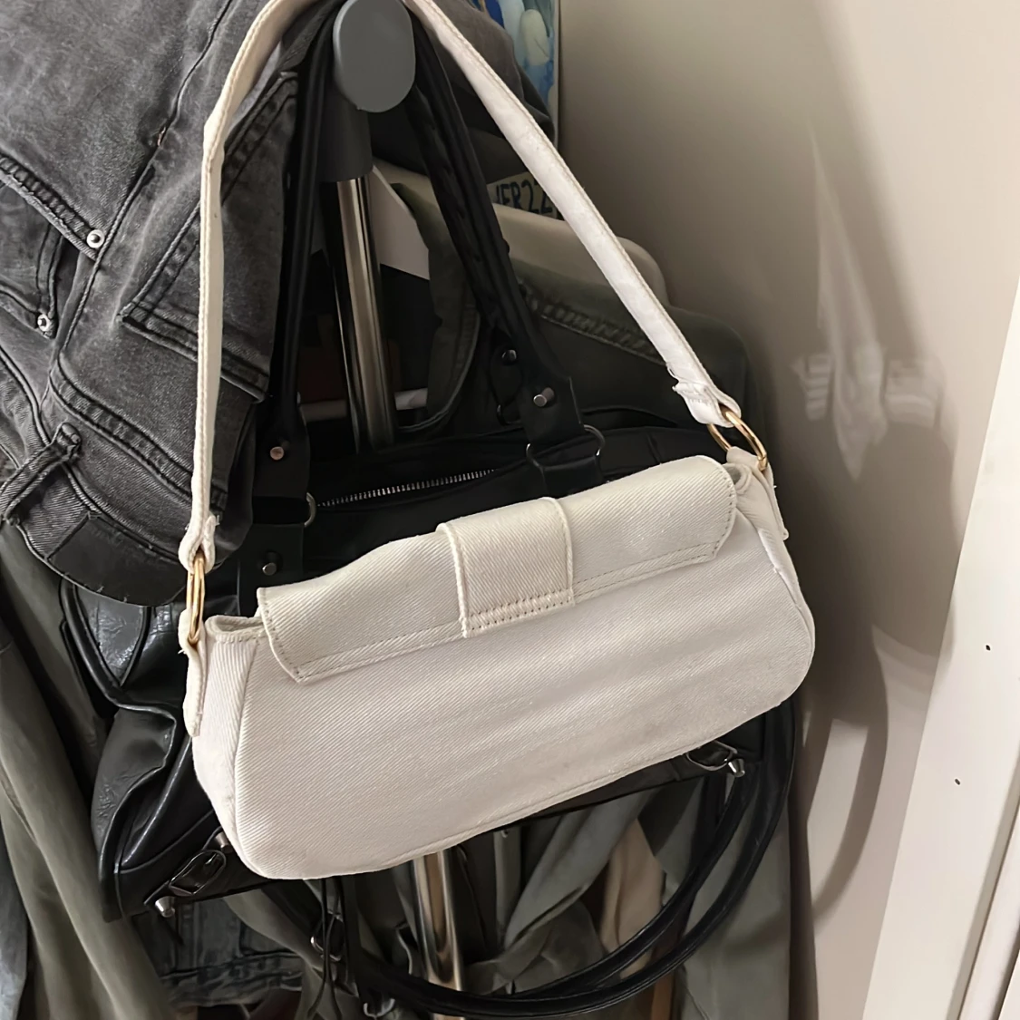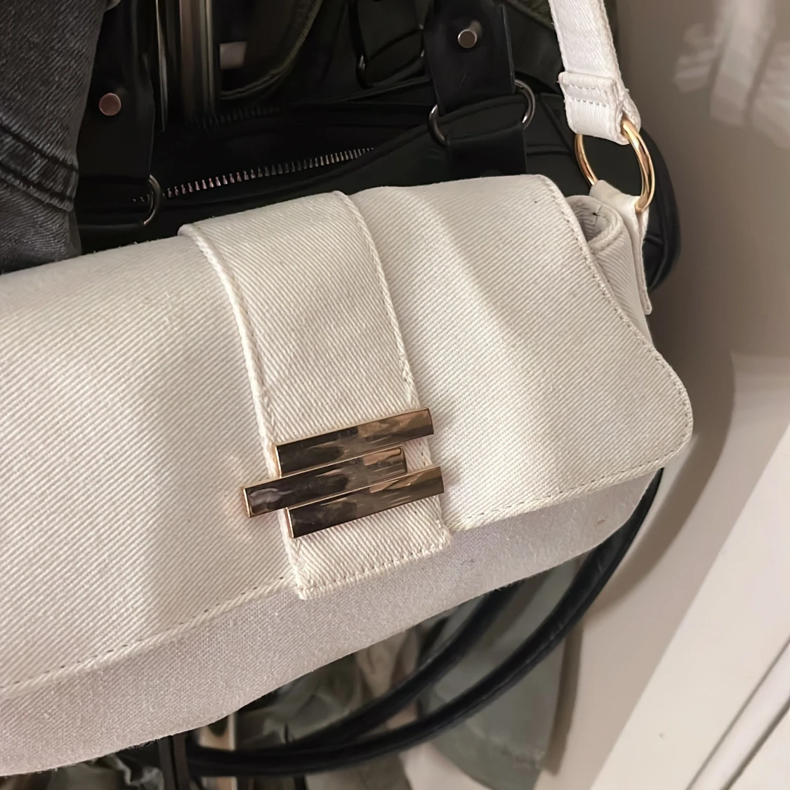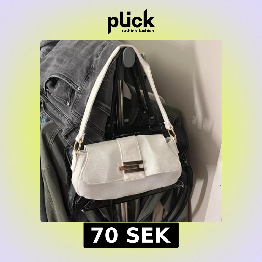 Säljer en stilren vit axelväska från ASOS i bomullstyg. Väskan har en avlång form, bred axelrem och snyggt guldfärgat spänne framtill. Perfekt för att lyfta din outfit med en clean och modern touch. Pris går att diskutera🤍