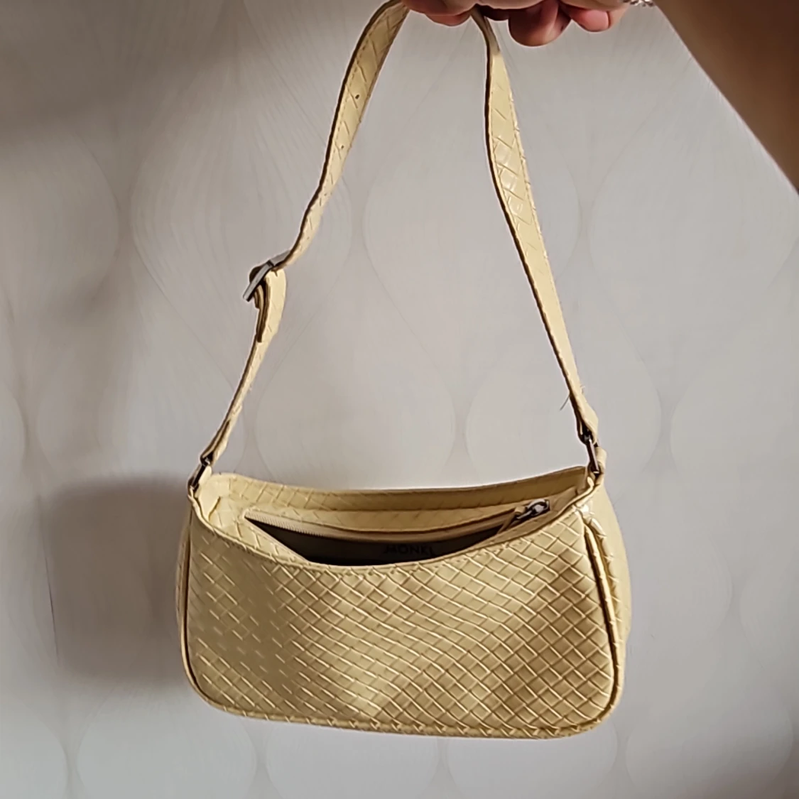 Fin ljusgul väska med ett fint mönster. Använd fåtal gångel och är i bra skick. Är liten och praktisk och kan hålla plånbok, mobil osv med mycket plats kvar.