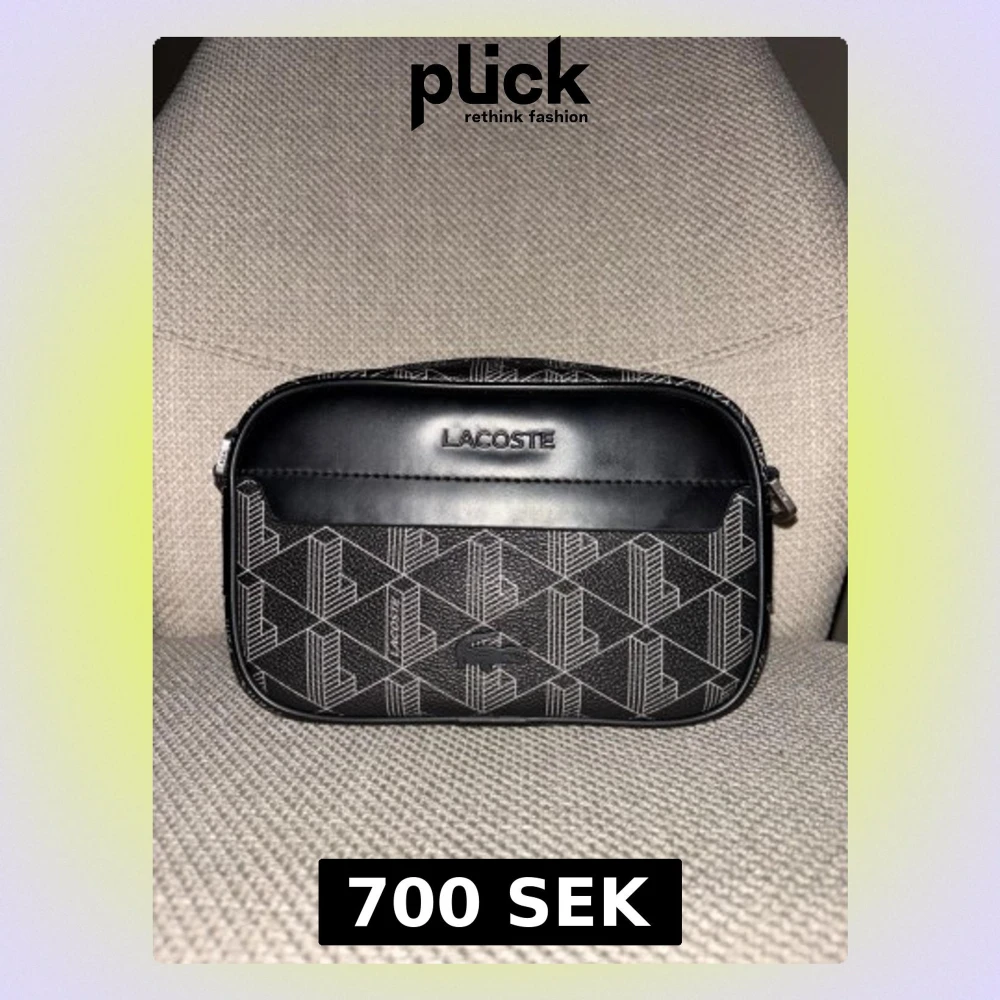 Snygg svart axelremsväska från Lacoste med geometriskt vitt mönster och silverfärgade detaljer. Väskan har justerbar axelrem, dragkedja och präglad Lacoste-logga framtill. Tillverkad i syntetmaterial med stilren design och praktiskt ytterfack. Köpt för 1750kr