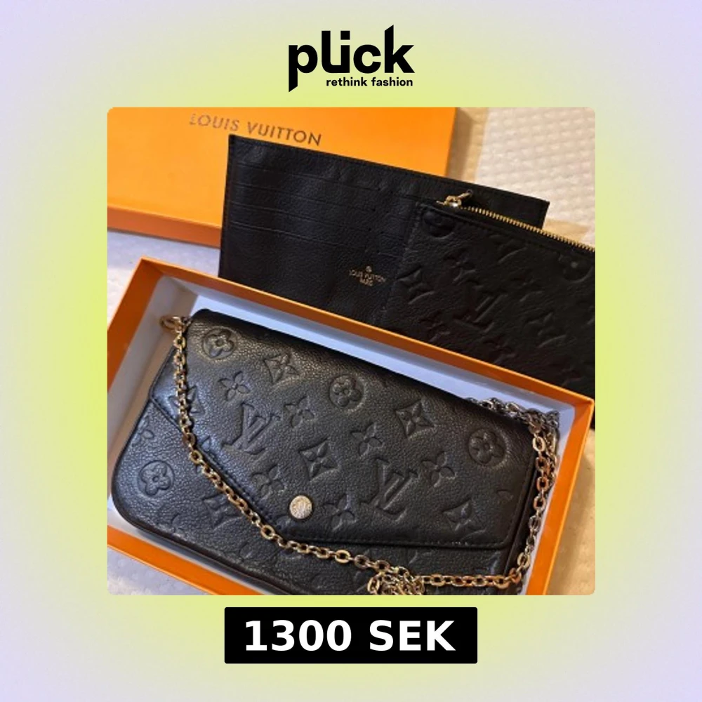 Snygg svart axelväska med klassiskt monogrammönster. Väskan har en elegant kedjerem och du får med 2 ”plånböcker”. Väskan är som ny men har tyvärr blivit lite platt men det går att lösa när man fyller väskan