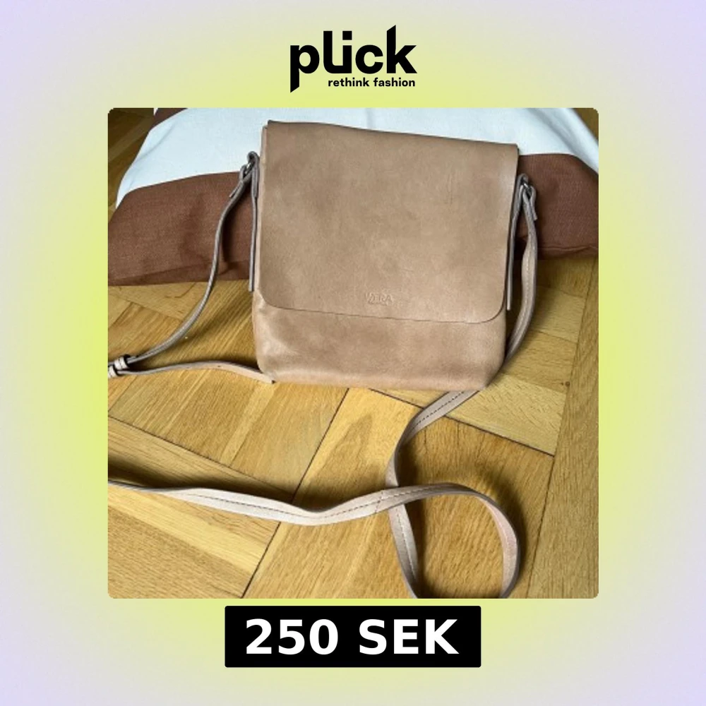 Säljer en stilren beige axelväska från Wera i mjukt skinn. Väskan har ett minimalistiskt uttryck med lock och justerbar axelrem. Perfekt storlek för det viktigaste och passar till många outfits. Enkel och snygg design utan synliga detaljer eller mönster.
