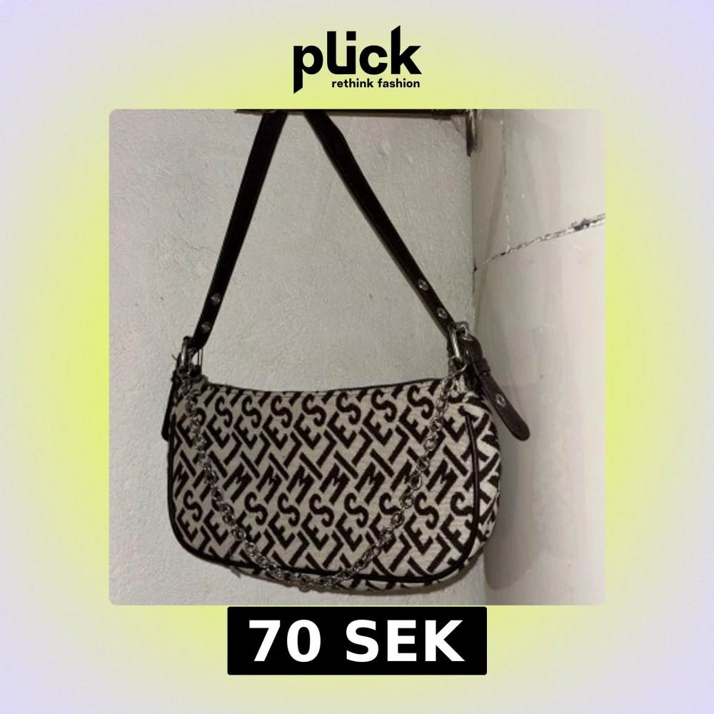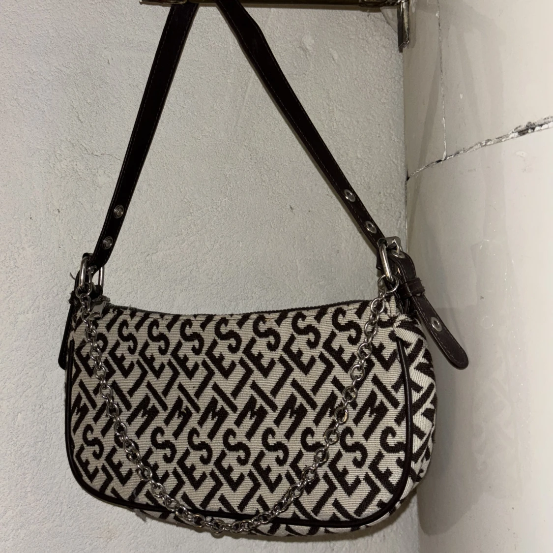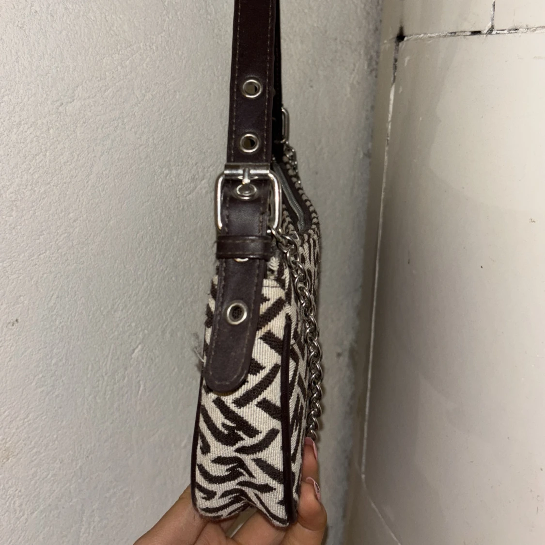Snygg axelväska med ett iögonfallande mönster i svart och beige. Väskan har en kedjedetalj framtill och justerbar axelrem i mörkt skinn. Perfekt för att ge din outfit en trendig touch.