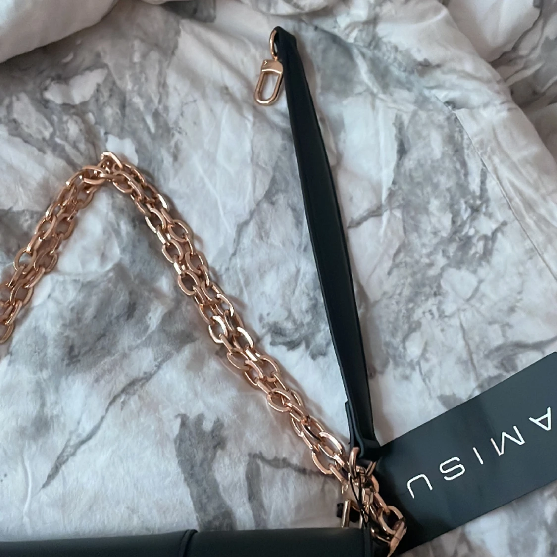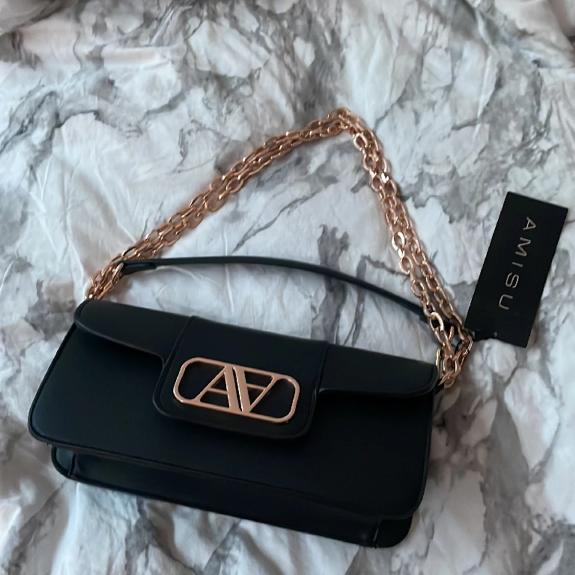 Svart axelväska som även går att ha som handväska om man vill ta bort kedjorna. Helt ny och aldrig använd prislappen sitter kvar.