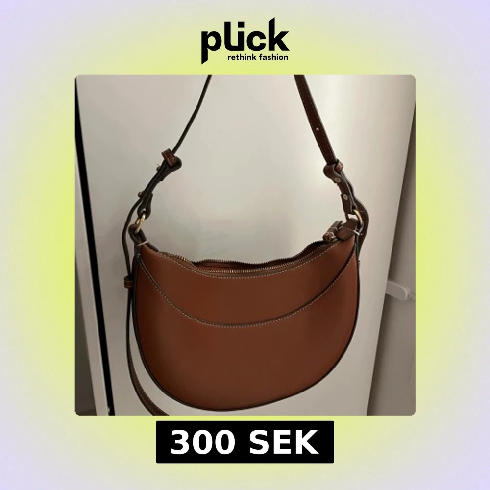 Snygg brun axelväska från Mango, i slätt skinn med justerbar rem och guldfärgade metalldetaljer. Väskan har en halvmåneform och dragkedja upptill. Invändigt finns en ficka för småsaker. Perfekt för dig som gillar stilren och klassisk design.