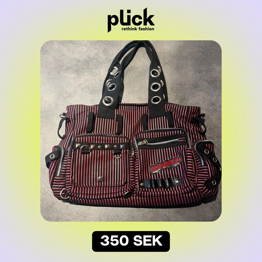 Cool randig väska från Banned i svart och rött. Den har flera fickor med dragkedjor och nitar som ger en edgy look. Perfekt för att ge din outfit en punkig touch. Handtagen har stora metallöljetter för extra stilpoäng. En unik väska för dig som vill sticka ut!