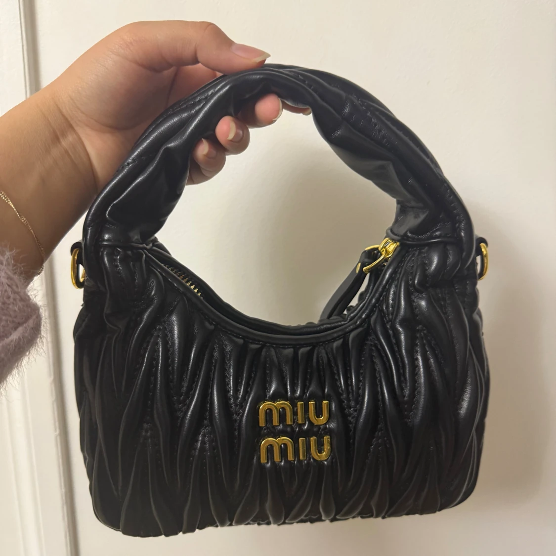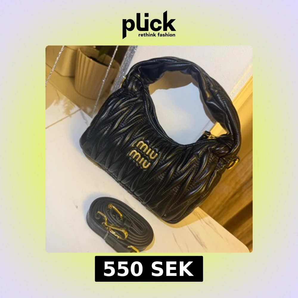 Snygg svart axelväska i quiltat skinn med guldiga detaljer och logotyp framtill. Väskan har en mjuk, rundad form och medföljande axelrem med guldfärgade spännen. Perfekt för dig som gillar lyxiga accessoarer med cool vibe.