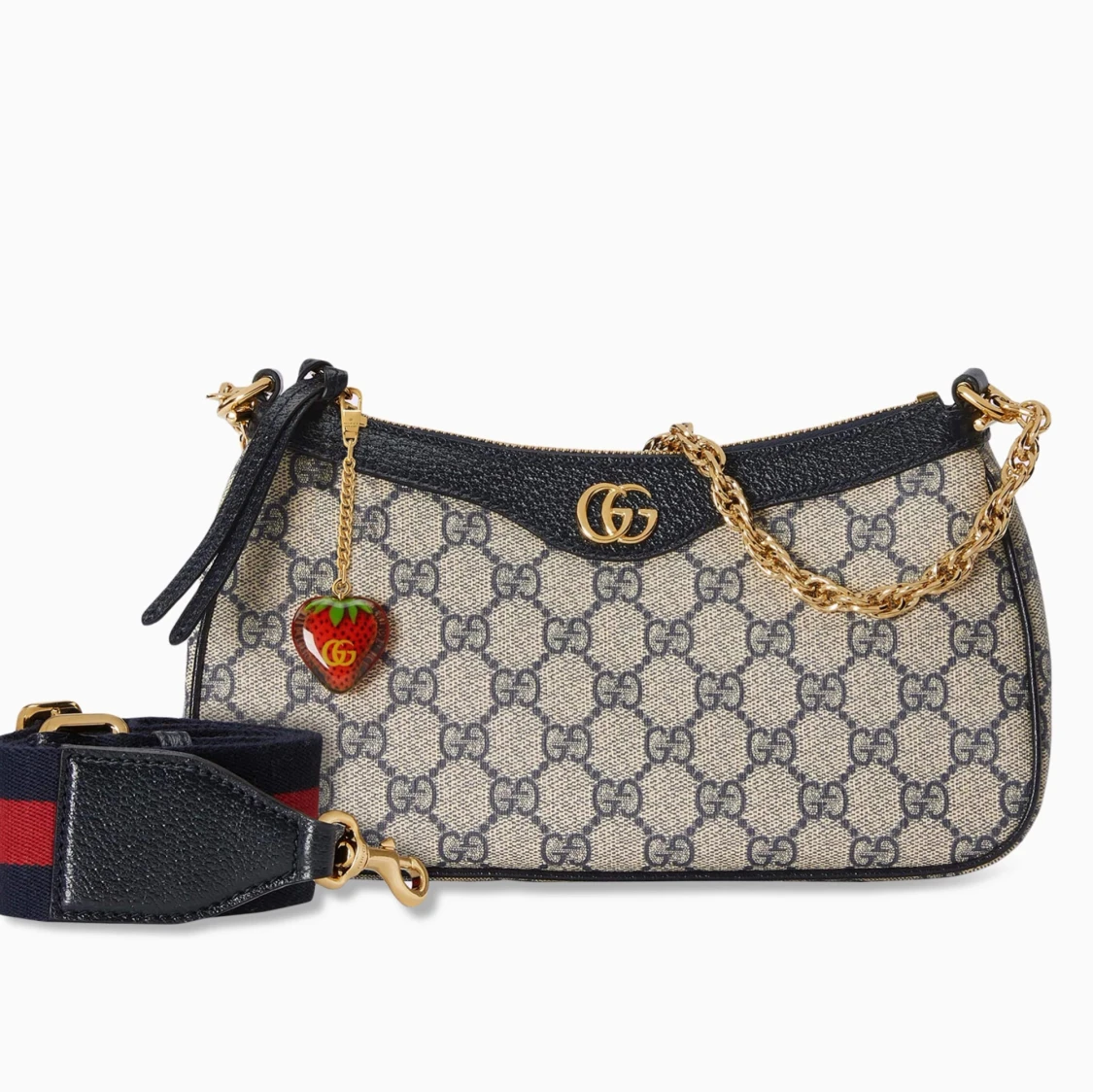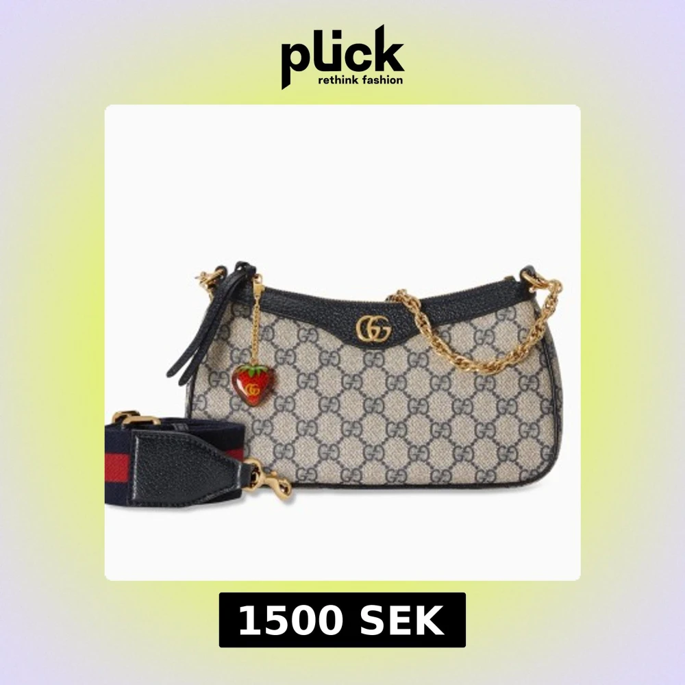 Helt ny och oanvänd. Snygg handväska med ett klassiskt mönster och guldfärgad kedja. Väskan har en dekorativ jordgubbshänge och detaljer i svart. Perfekt för att ge din outfit en lyxig touch. (Kommer med dustbag och låda) pris kan diskuteras.