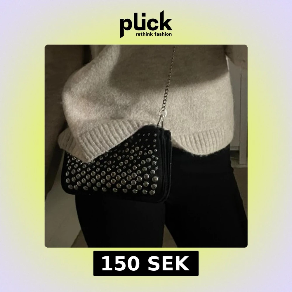 Svart kuvertväska med massor av silverfärgade nitar på framsidan. Väskan har en avtagbar kedja i silvermetall och stängs med dragkedja. Perfekt storlek för mobilen och det viktigaste. I mocka immitation.