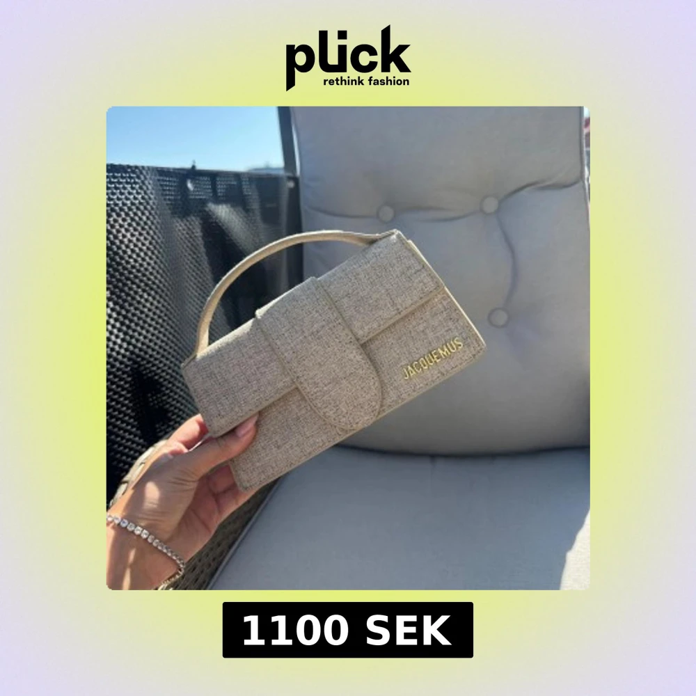 Säljer en stilren beige handväska i linne med guldiga bokstäver på framsidan. Väskan har ett elegant, rektangulärt format och ett kort handtag. Perfekt för dig som gillar minimalistisk och trendig design. Band tillkommer