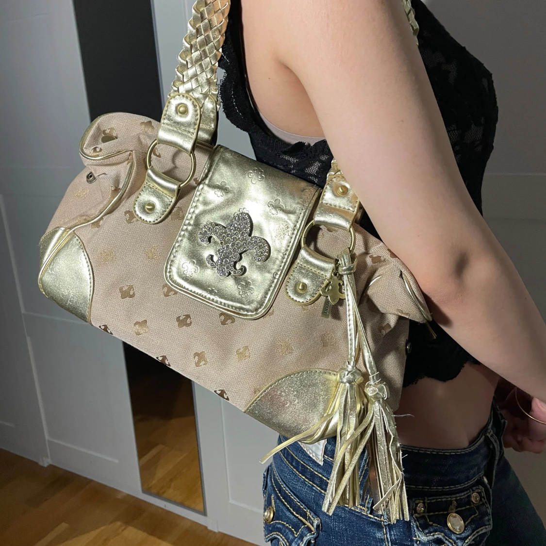 Säljer en snygg beig och guld väska från Friis and company.Väskan har en flik med en glittrig detalj och tofsar som hänger ner. två rhinestones har gått av men annars av bra skick💕