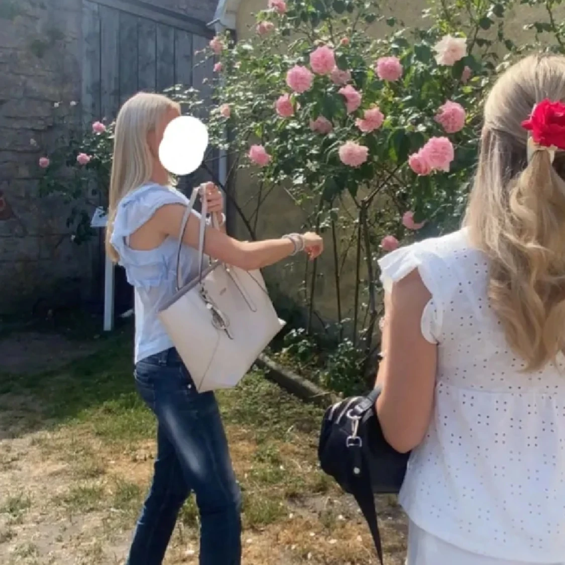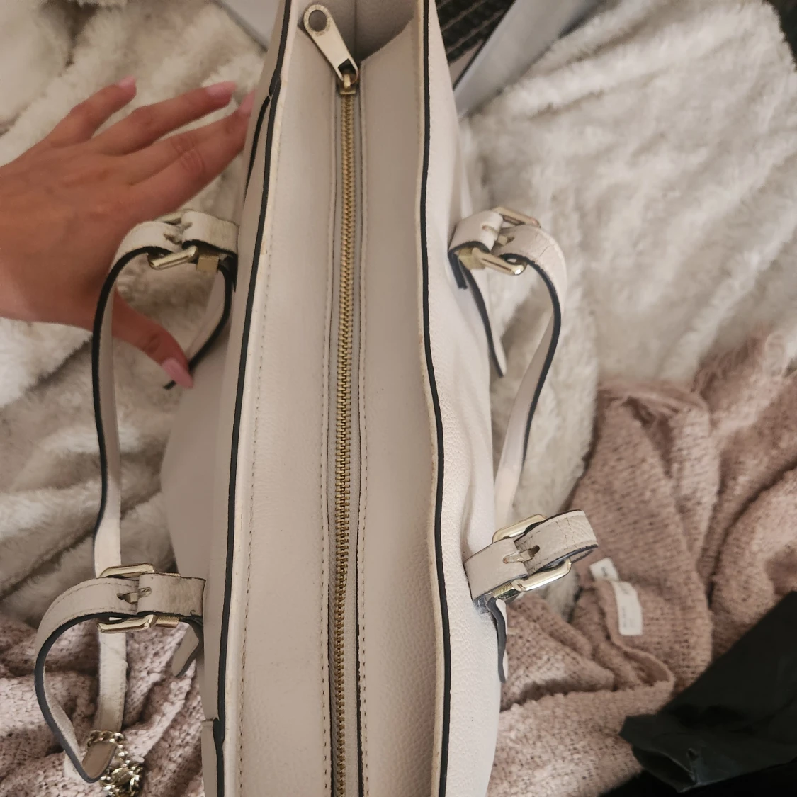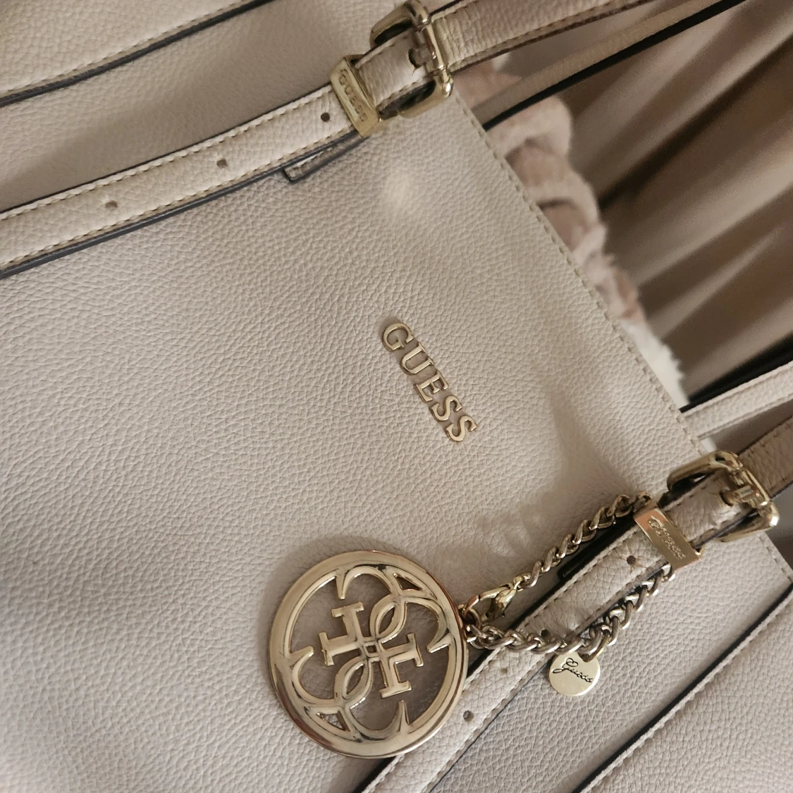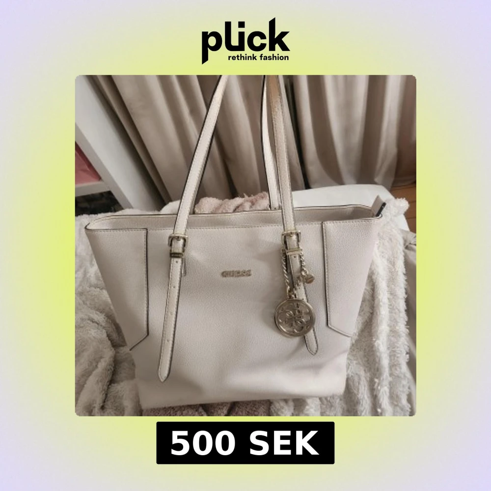Stilren beige väska från Guess med justerbara axelband, guldfärgade detaljer och dragkedja upptill. Väskan har en snygg Guess-logga framtill och en dekorativ guldfärgad berlock. Handtagen och hörnen Vad botten är lite slitna, men inget som syns vid användning💗Stor och rymlig, perfekt till skolan eller vardag.