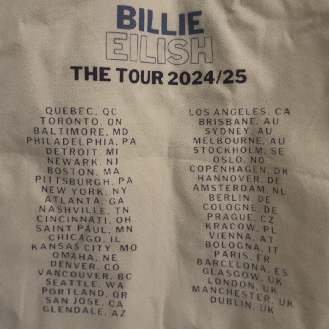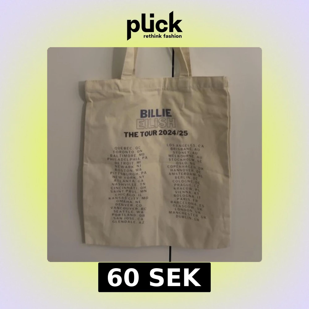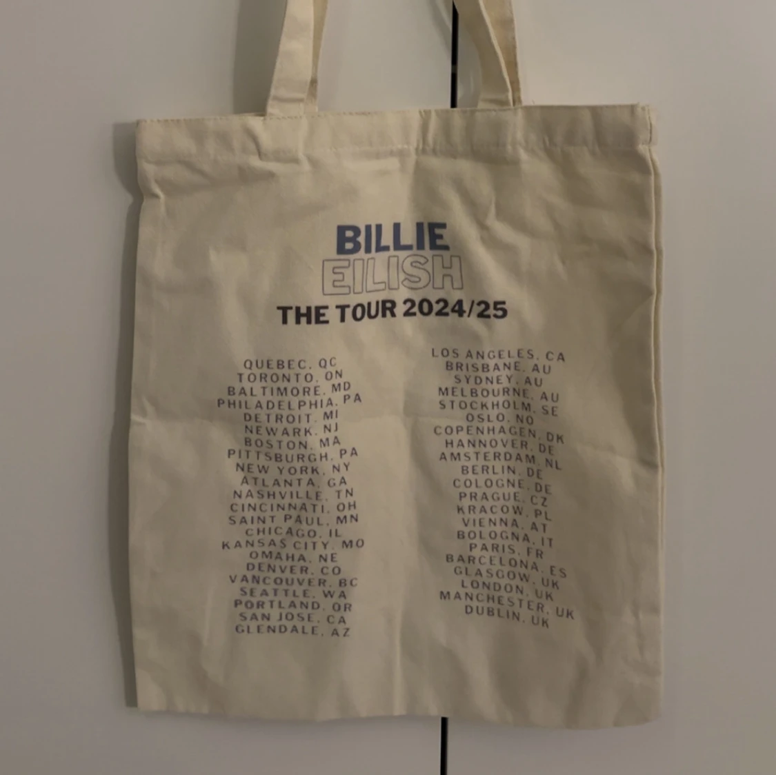 Snygg tygkasse i beige med tryck från Billie Eilish The Tour 2024/25. Väskan har blå och svart text med turnéstäder på framsidan. Perfekt för dig som vill visa din kärlek till Billie och ha en praktisk väska till vardagen.