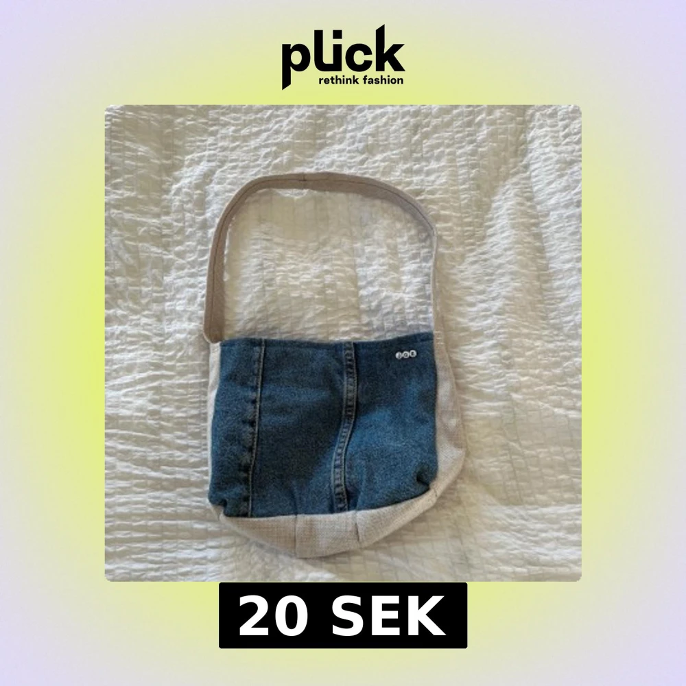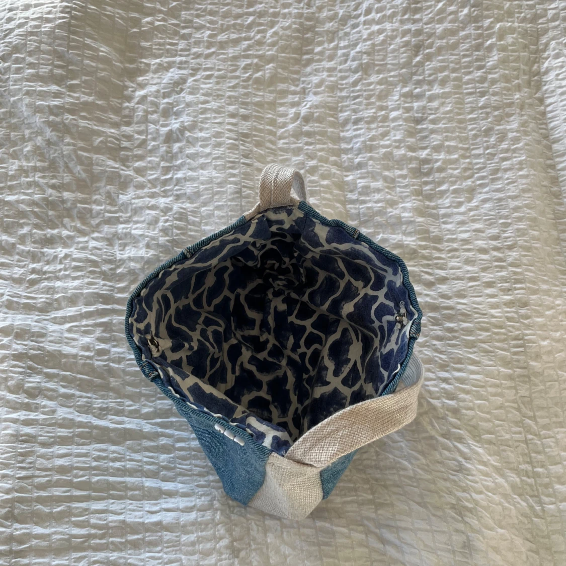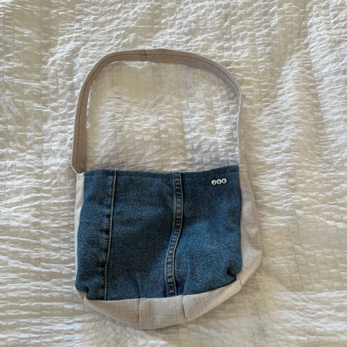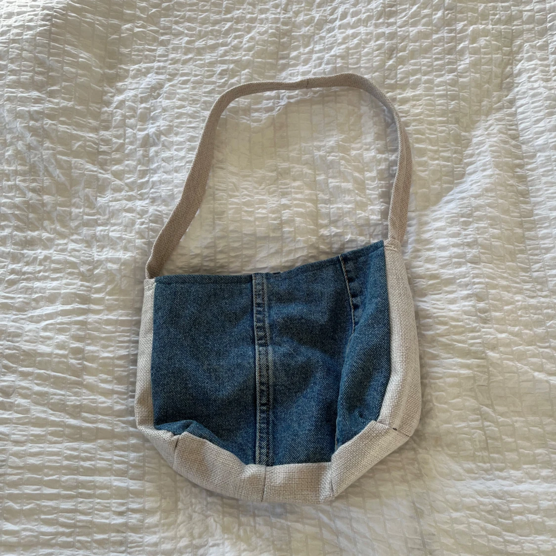 Snygg axelväska i blått jeansmaterial med beige bomullskanter och axelrem. Insidan har ett coolt blåvitt mönstrat foder som ger extra stilpoäng. Perfekt storlek för att bära med sig det viktigaste och passar till många olika outfits.💕