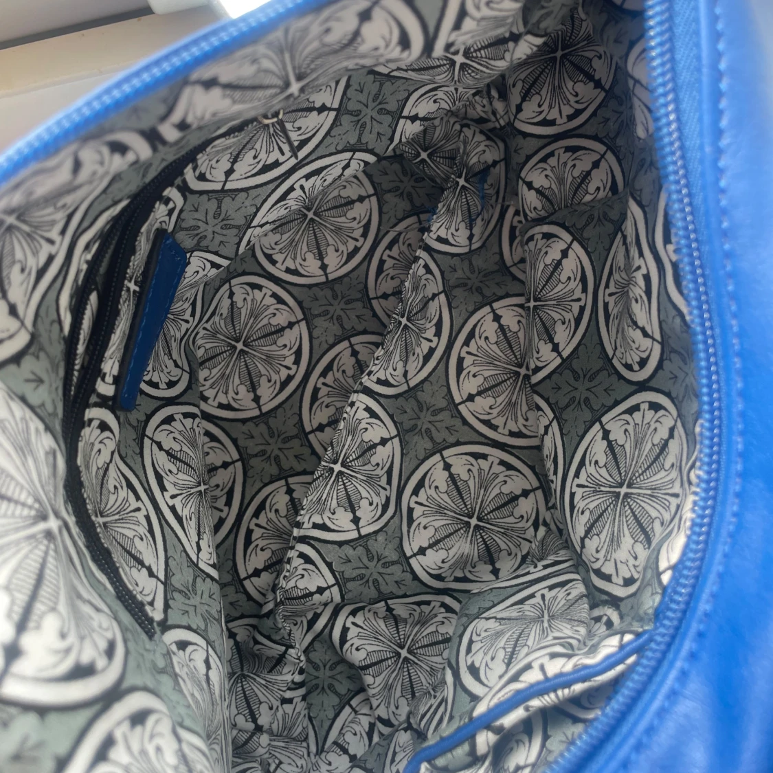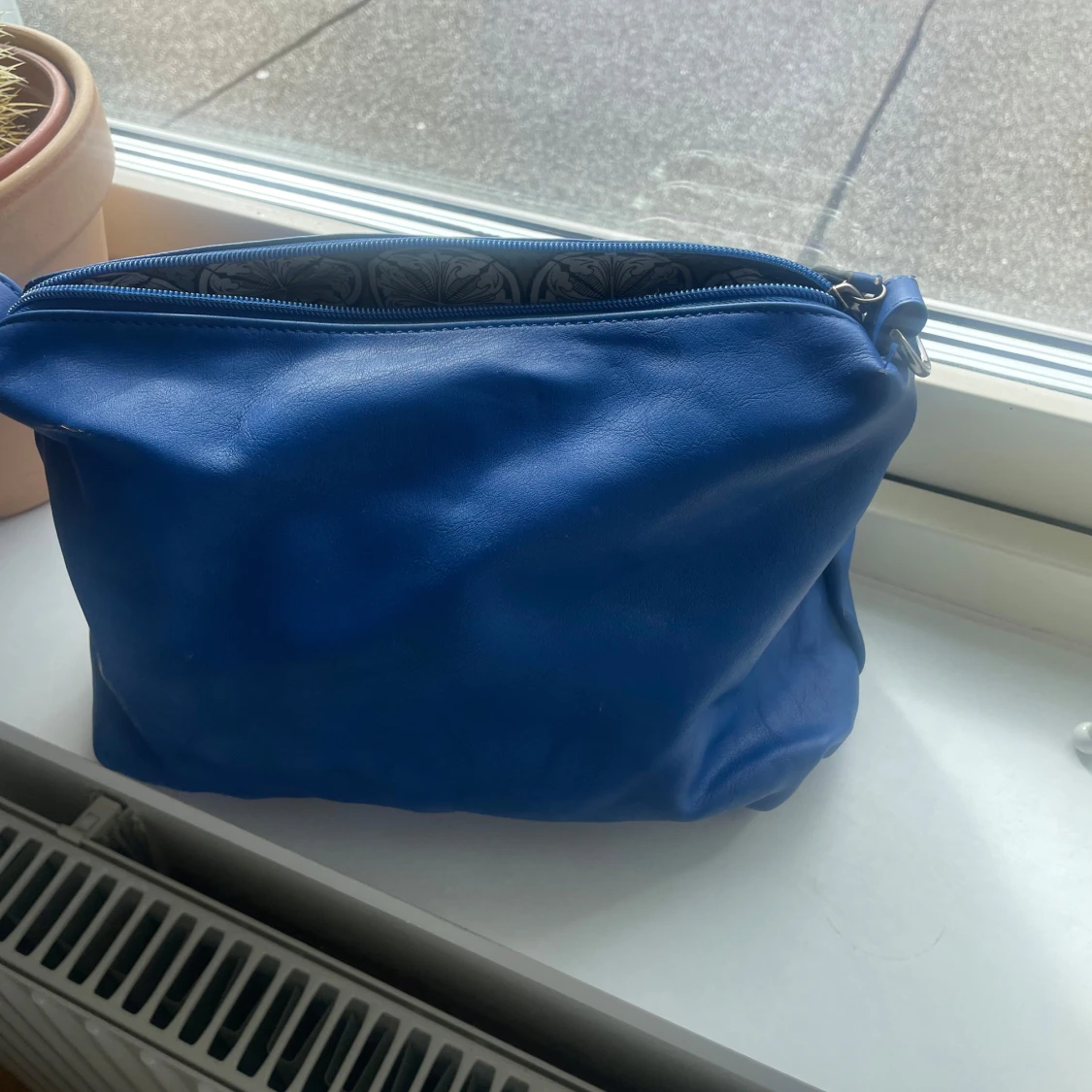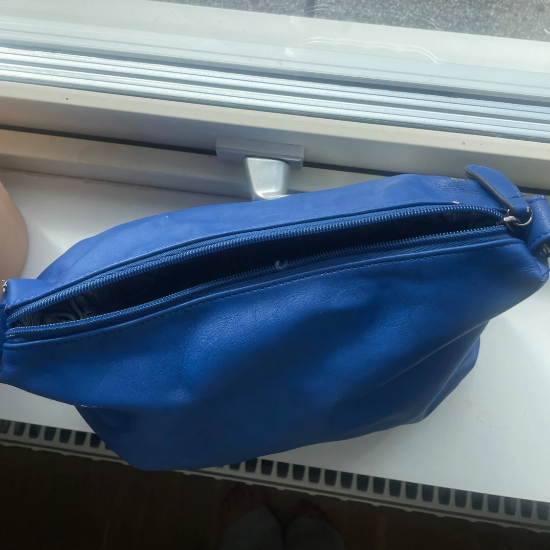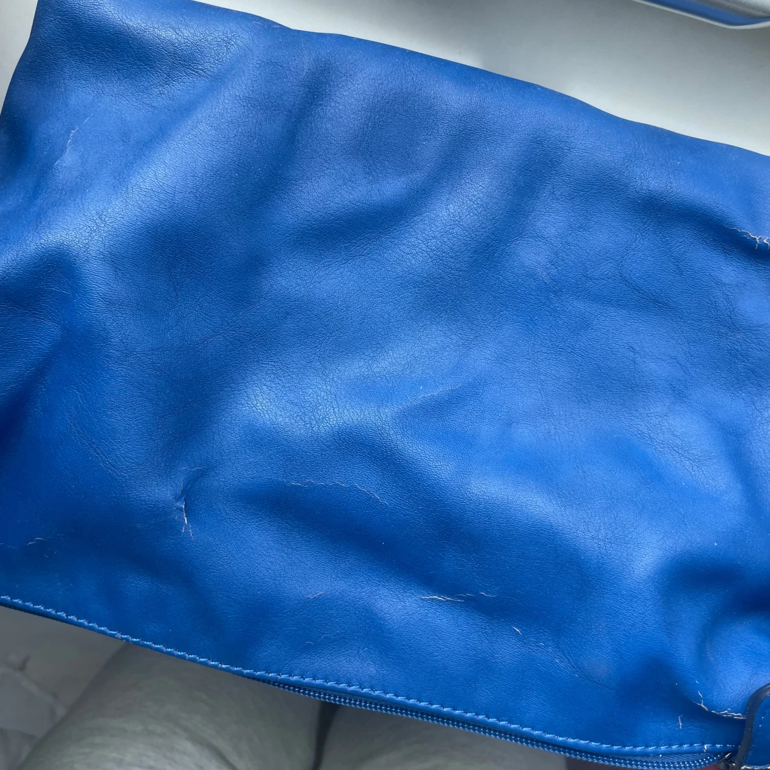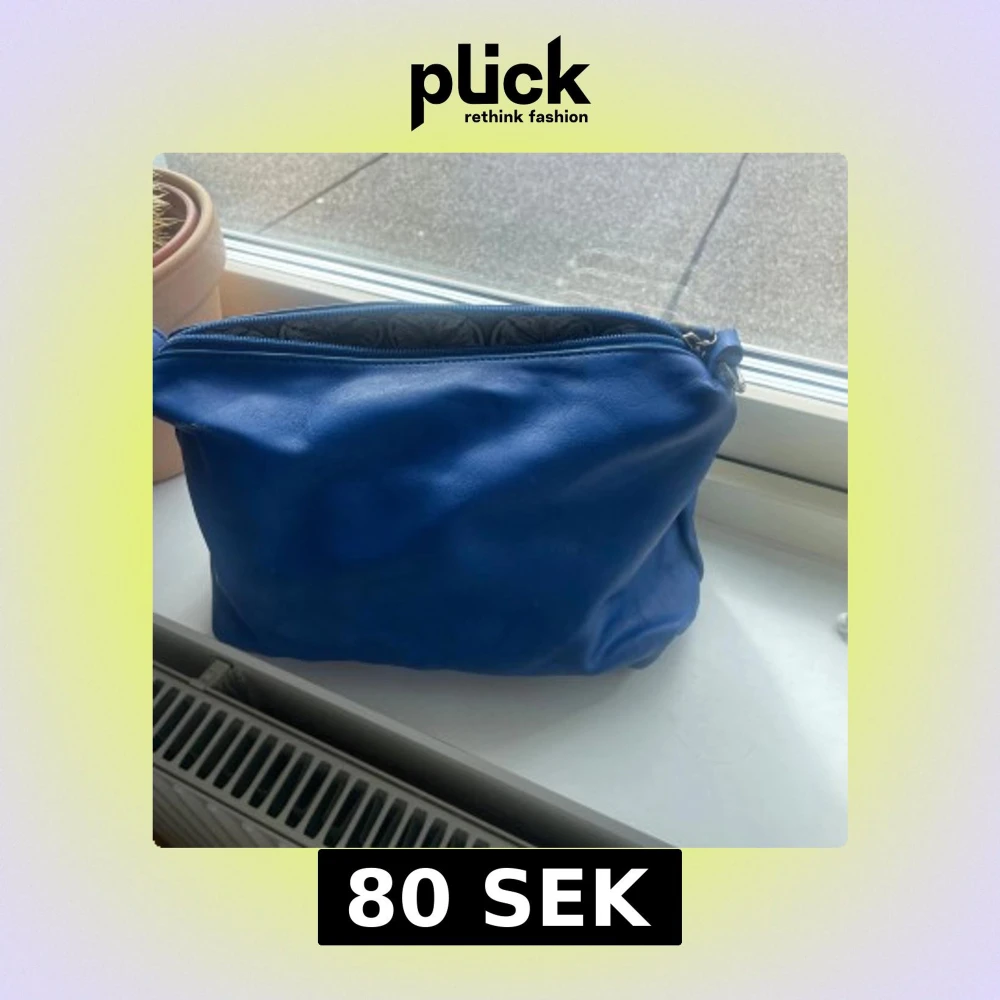 Snygg blå pouch, pouchbag, väska, necessär i skinn med ett mönstrat. Väskan har en praktisk dragkedja upptill för säker förvaring av dina saker. Perfekt för att ge en färgklick till din outfit.
