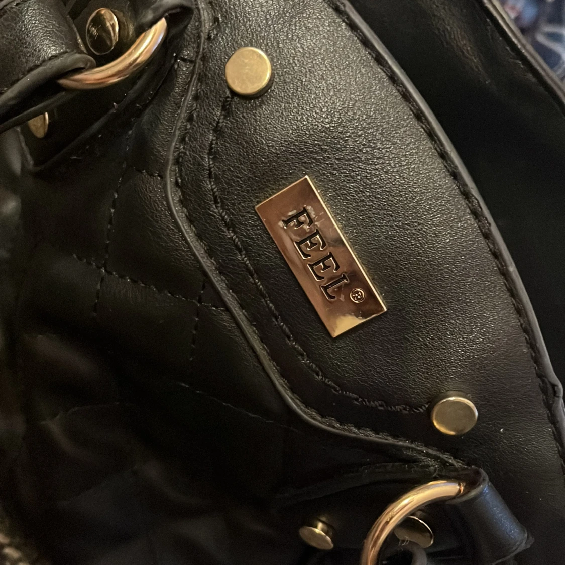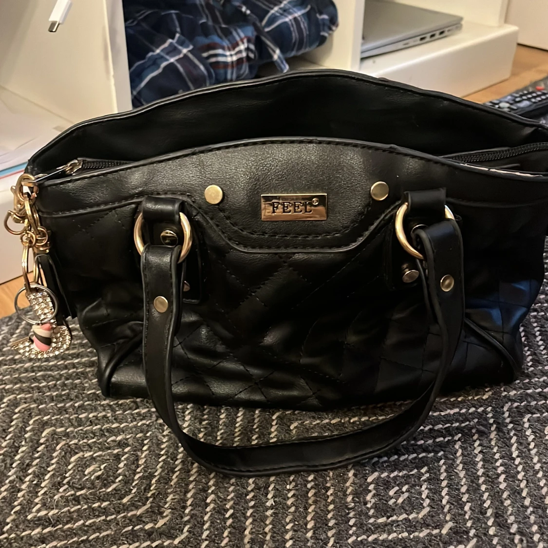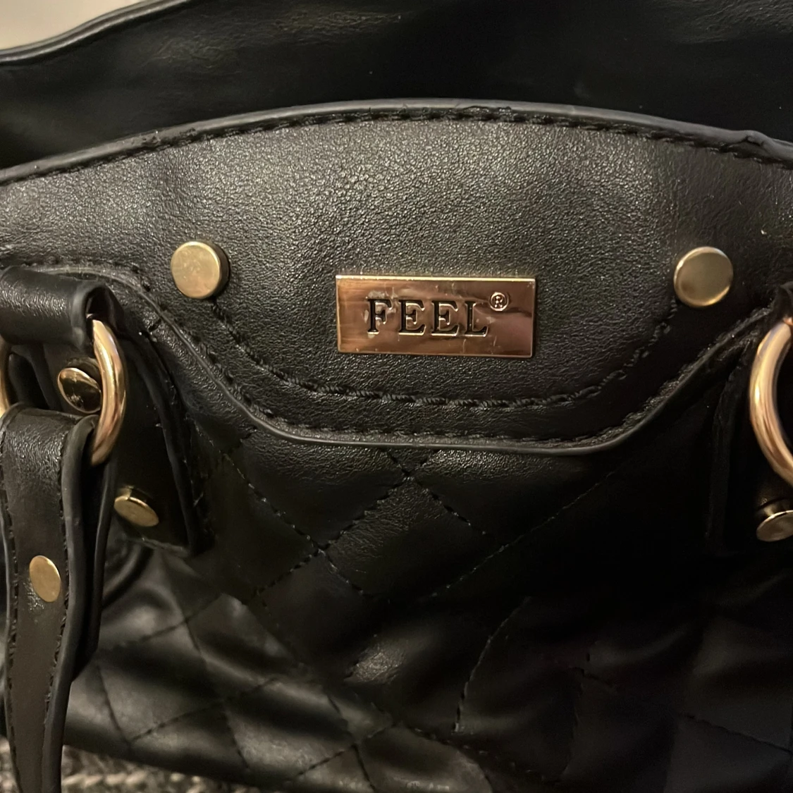 Snygg svart axelväska från FEEL med quiltad design och guldfärgade metalldetaljer. Väskan har dubbla handtag och dragkedja upptill. Perfekt för att bära dina viktigaste saker och ger en stilren look.