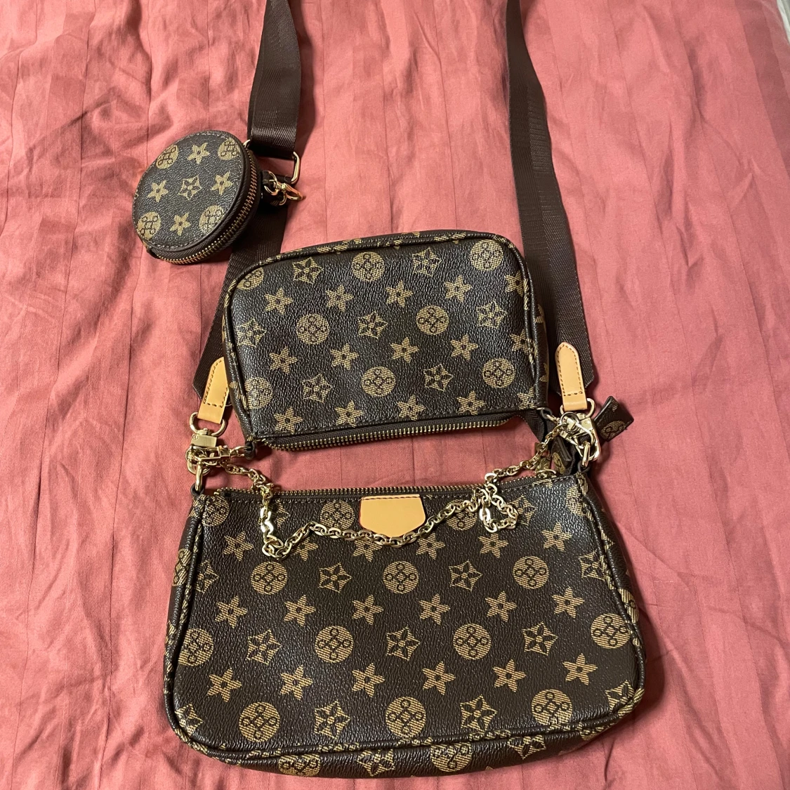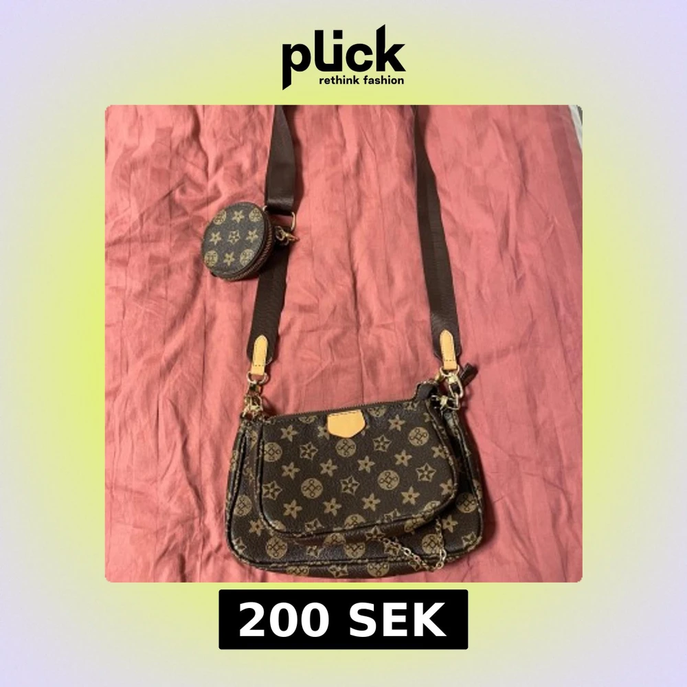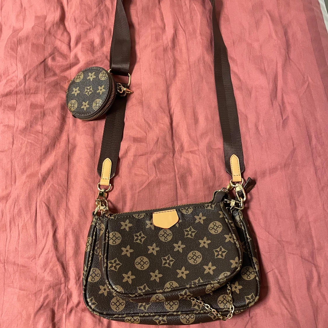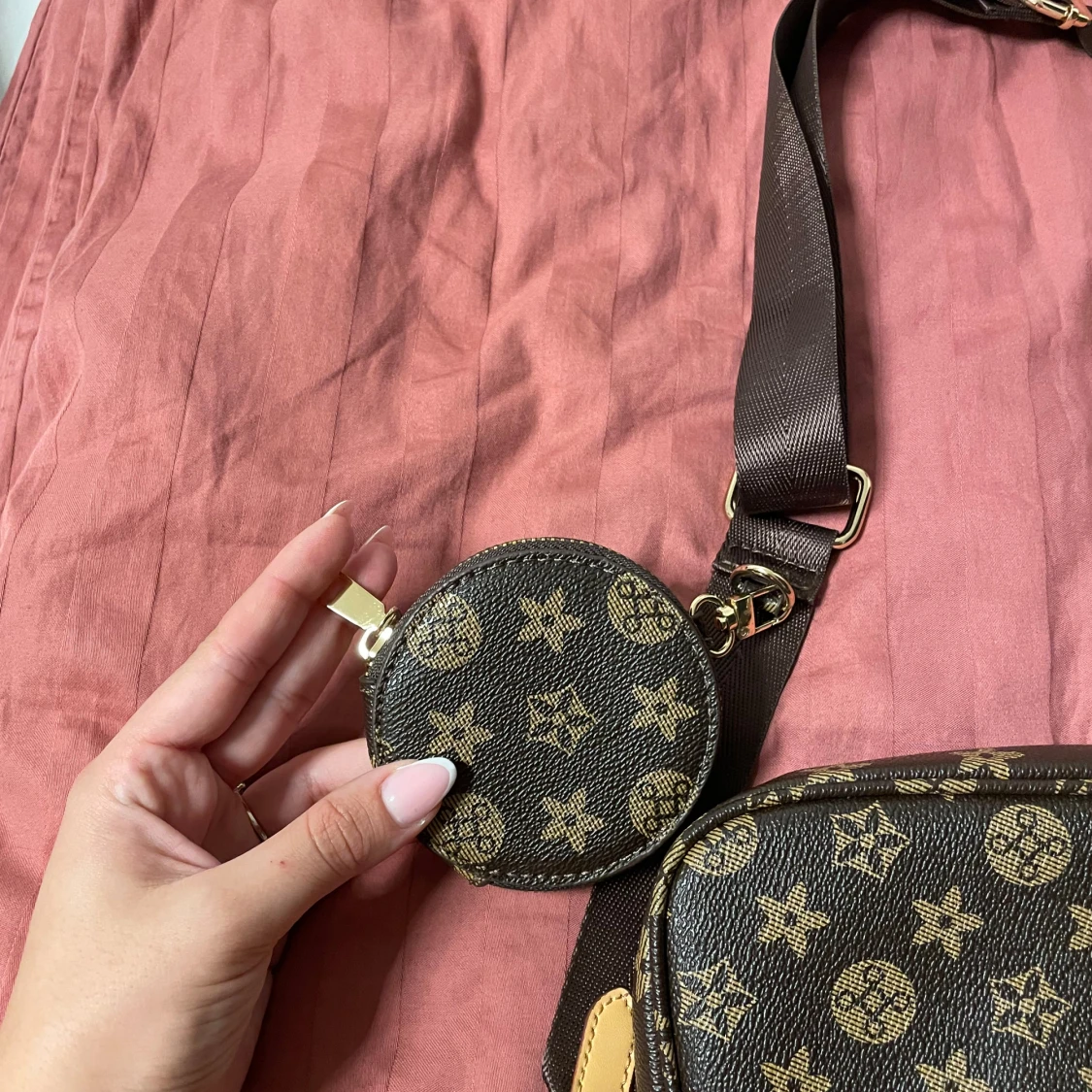 Cool brun axelväska med flera fack och avtagbar rund myntplånbok. Väskan har guldiga detaljer, kedja och justerbar axelrem. Oanvänd