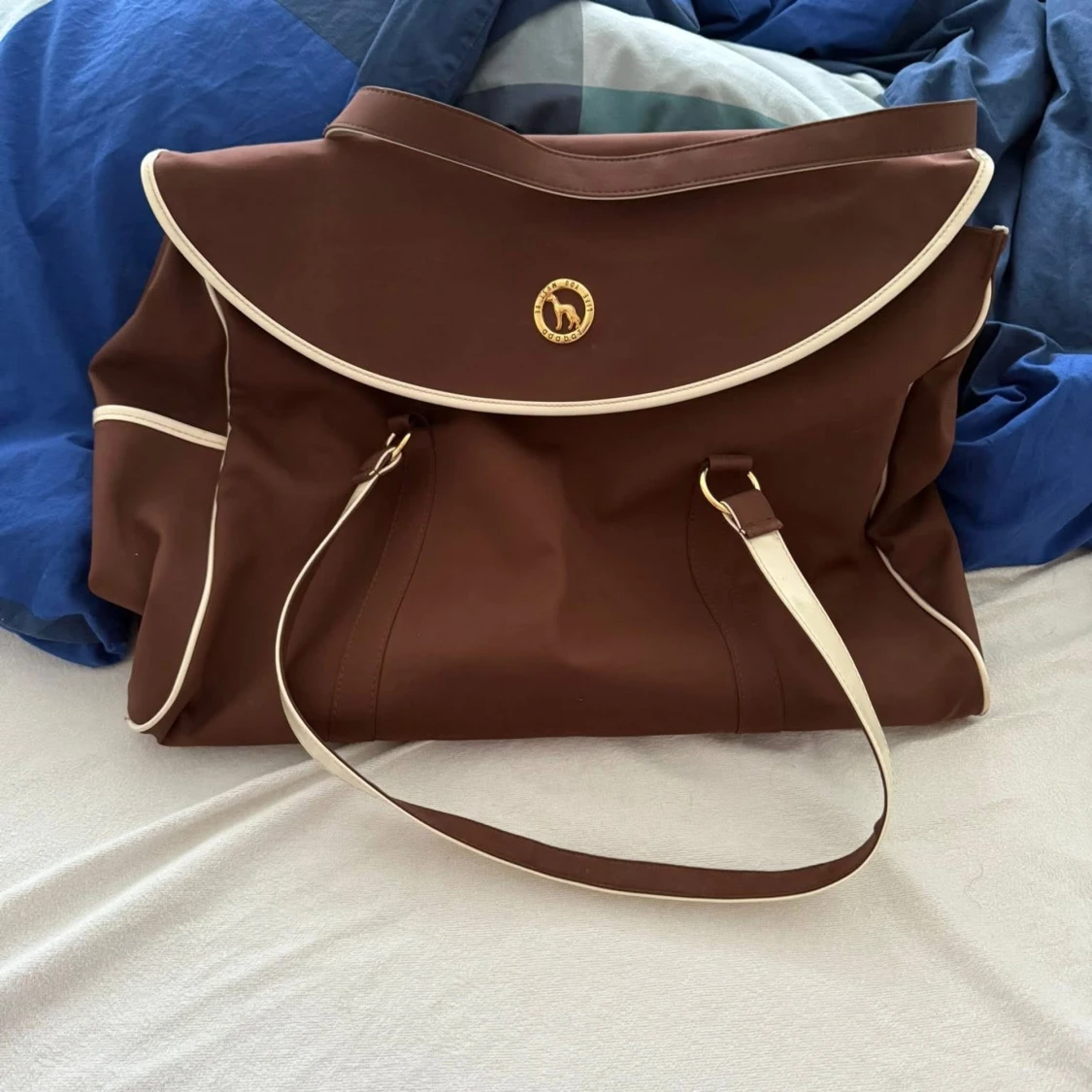 Stilren brun axelväska från Fjällräven med vita detaljer och klassisk logga framtill. Väskan har en stor locköppning och långa axelband, perfekt för att bära med sig allt man behöver. Materialet är slitstarkt och väskan har en retrovibe.