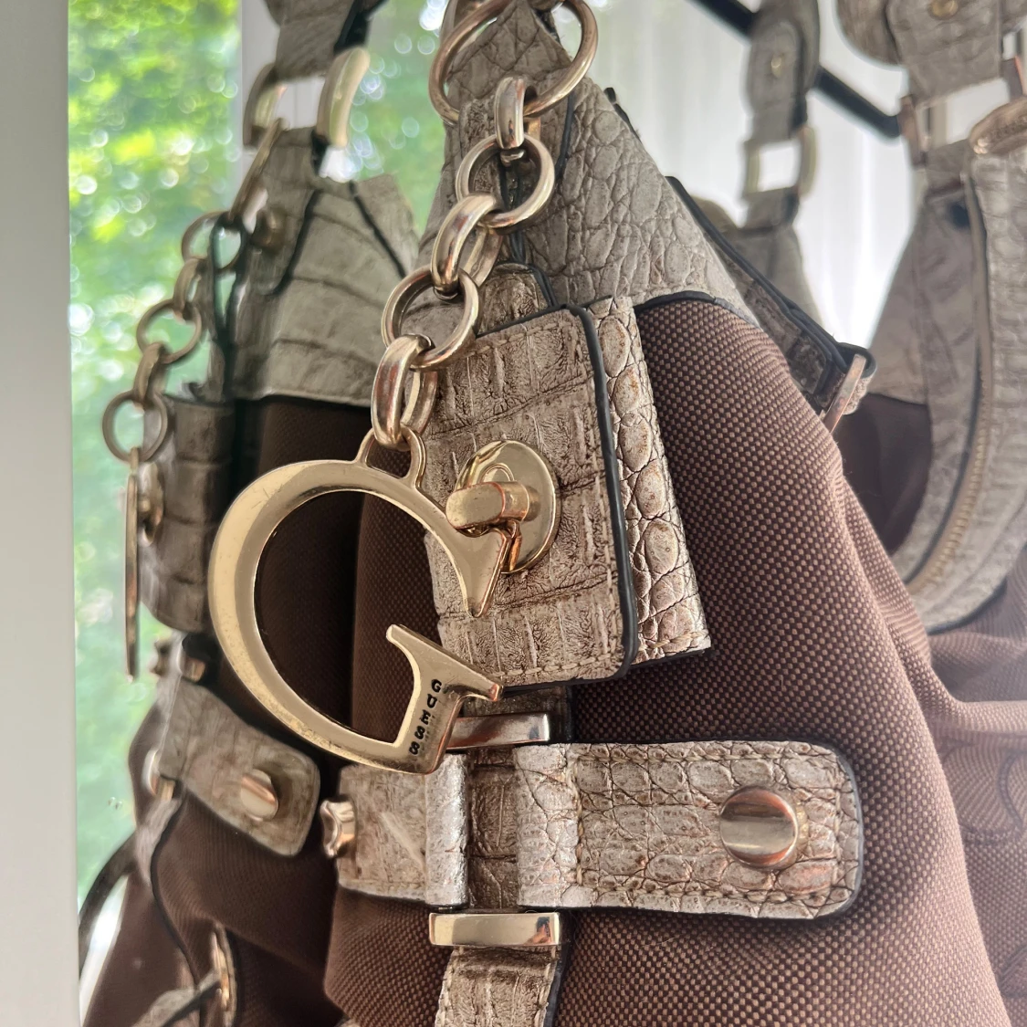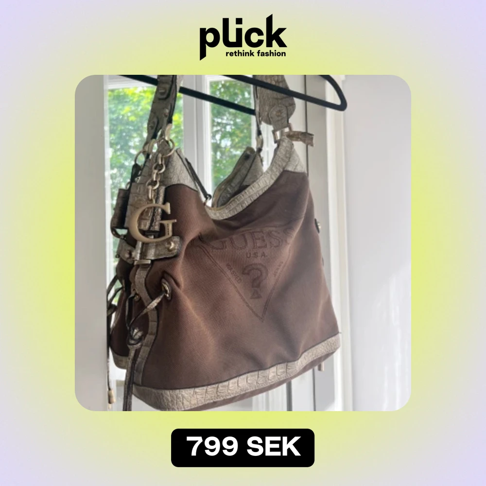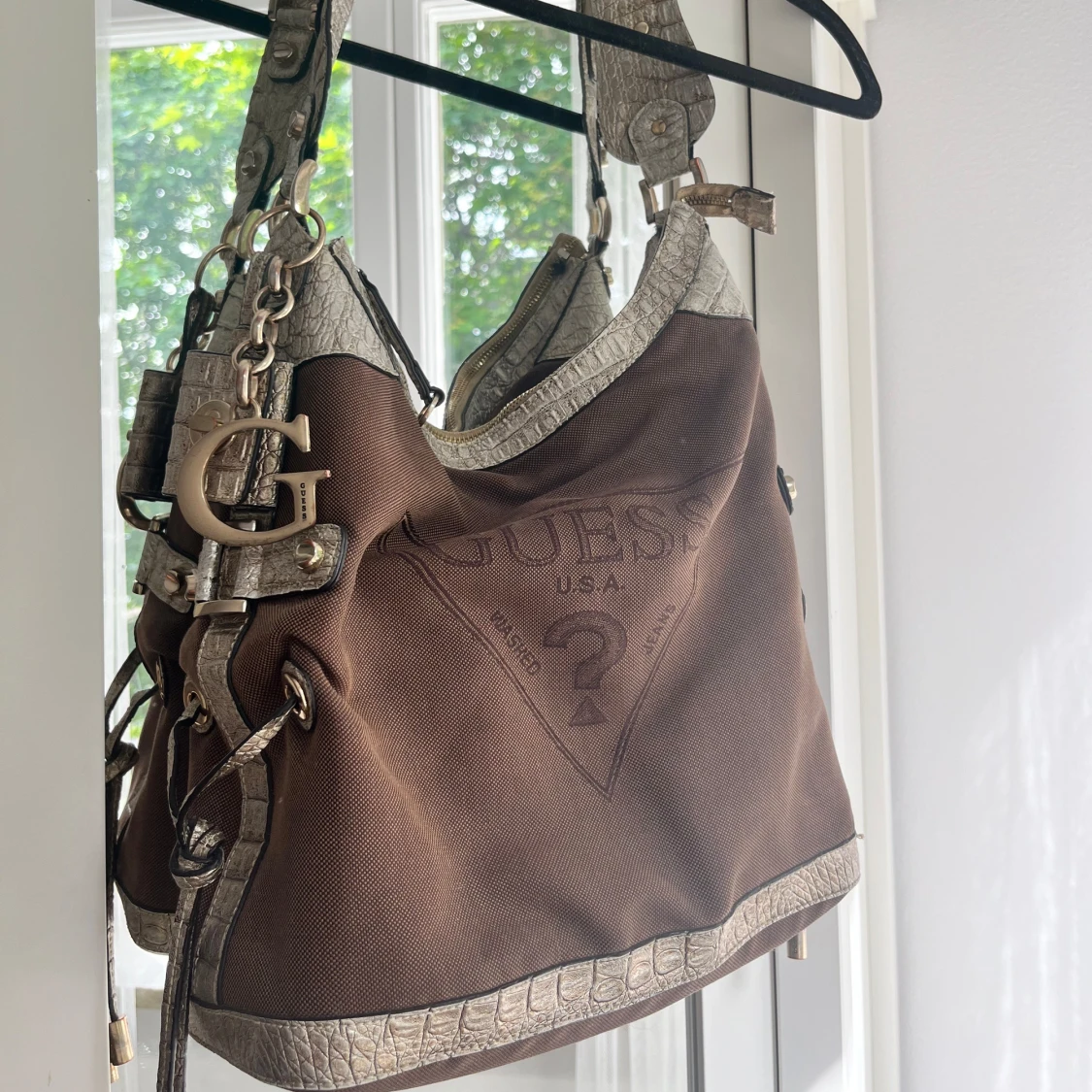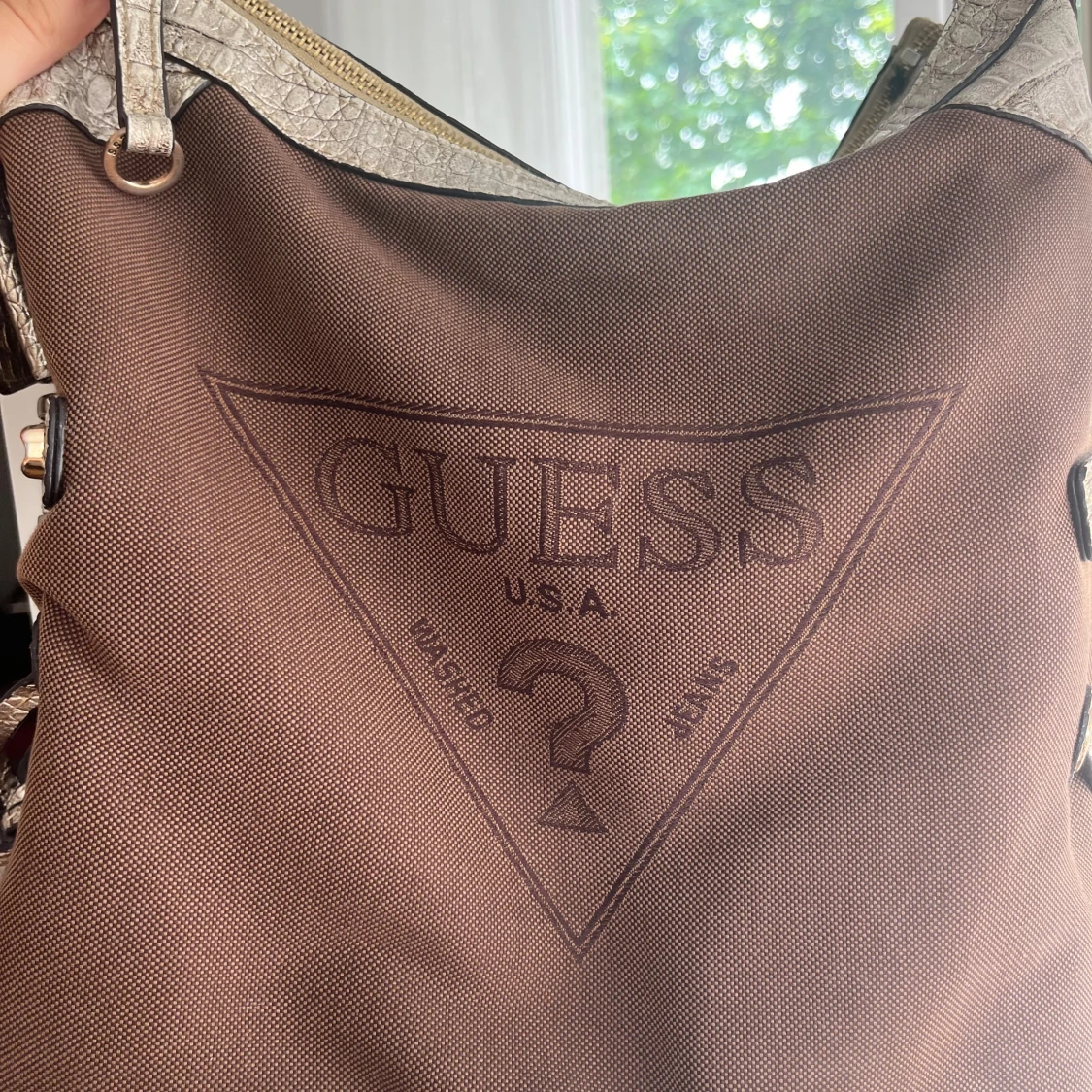 Säljer en snygg brun axelväska från Guess med coola detaljer i silver. Väskan har ett stort Guess-logotyp på framsidan och är gjord i ett slitstarkt material. Den har också en praktisk dragkedja och stiliga kedjor som ger den en extra touch. Perfekt för både vardag och fest! Pris går att diskutera 💕