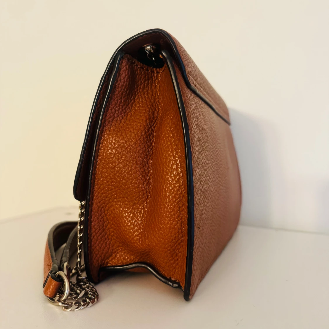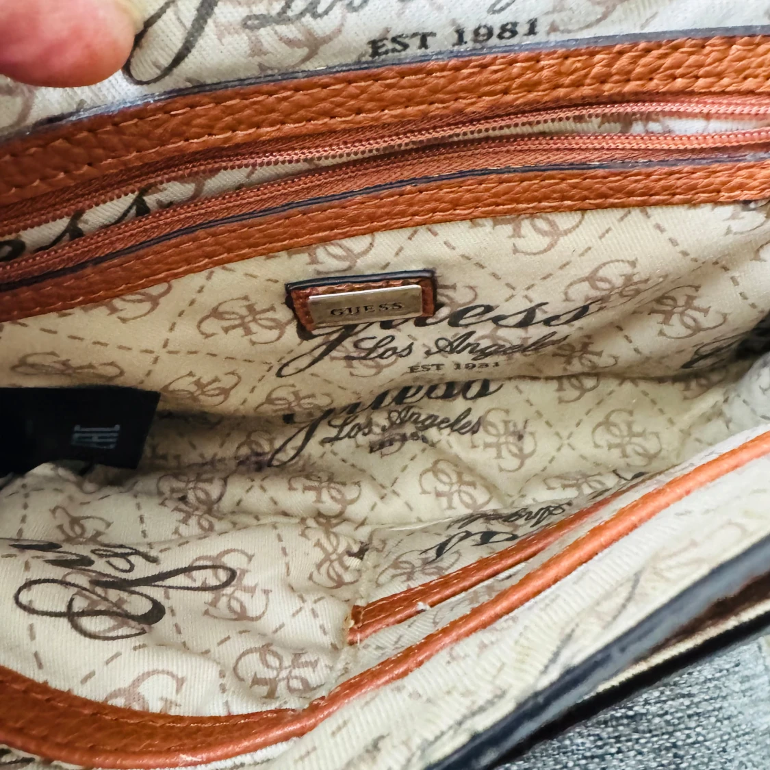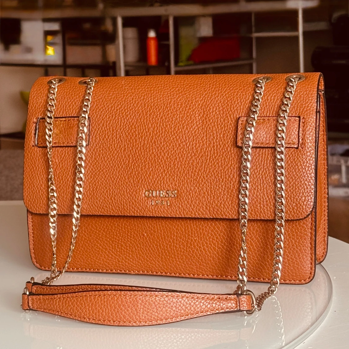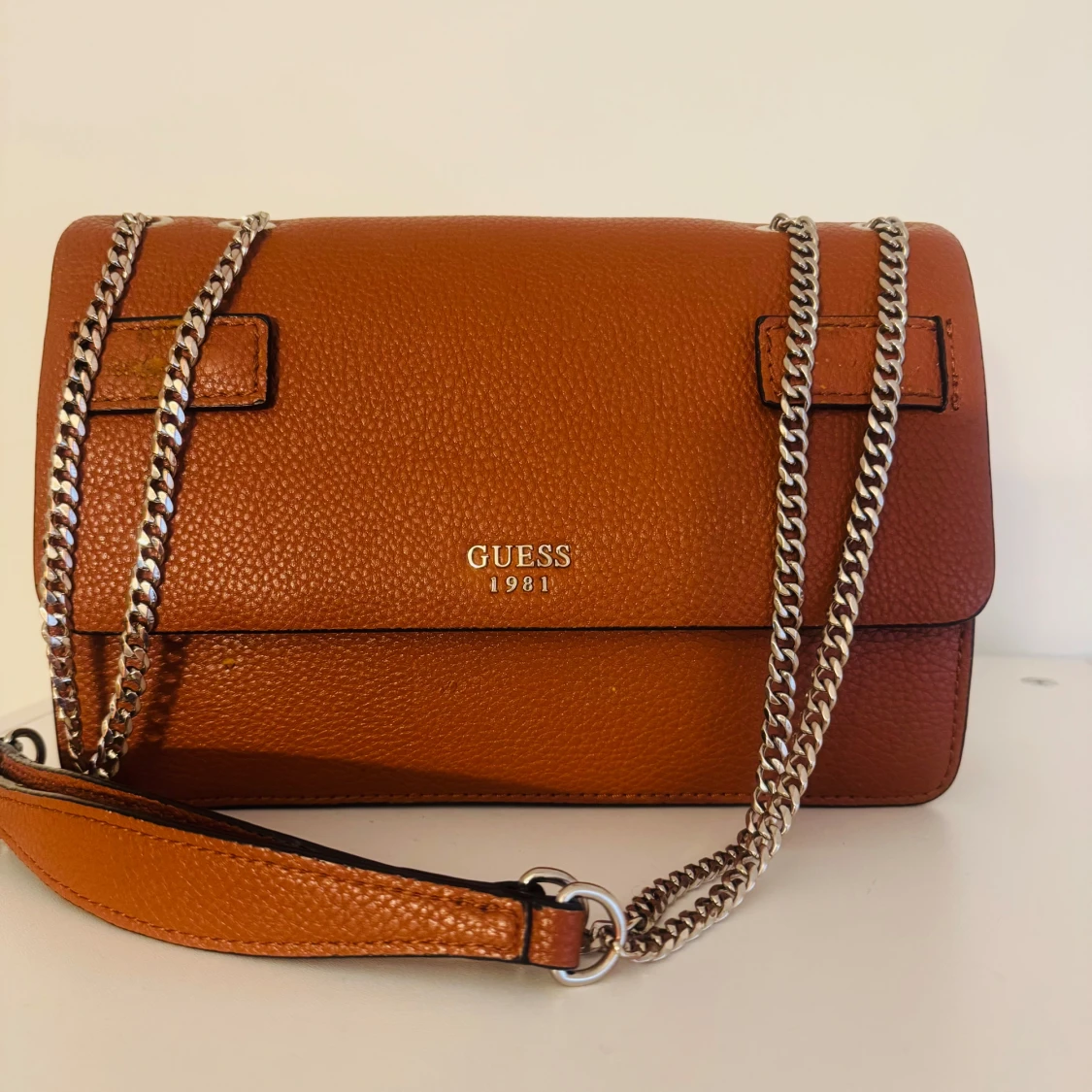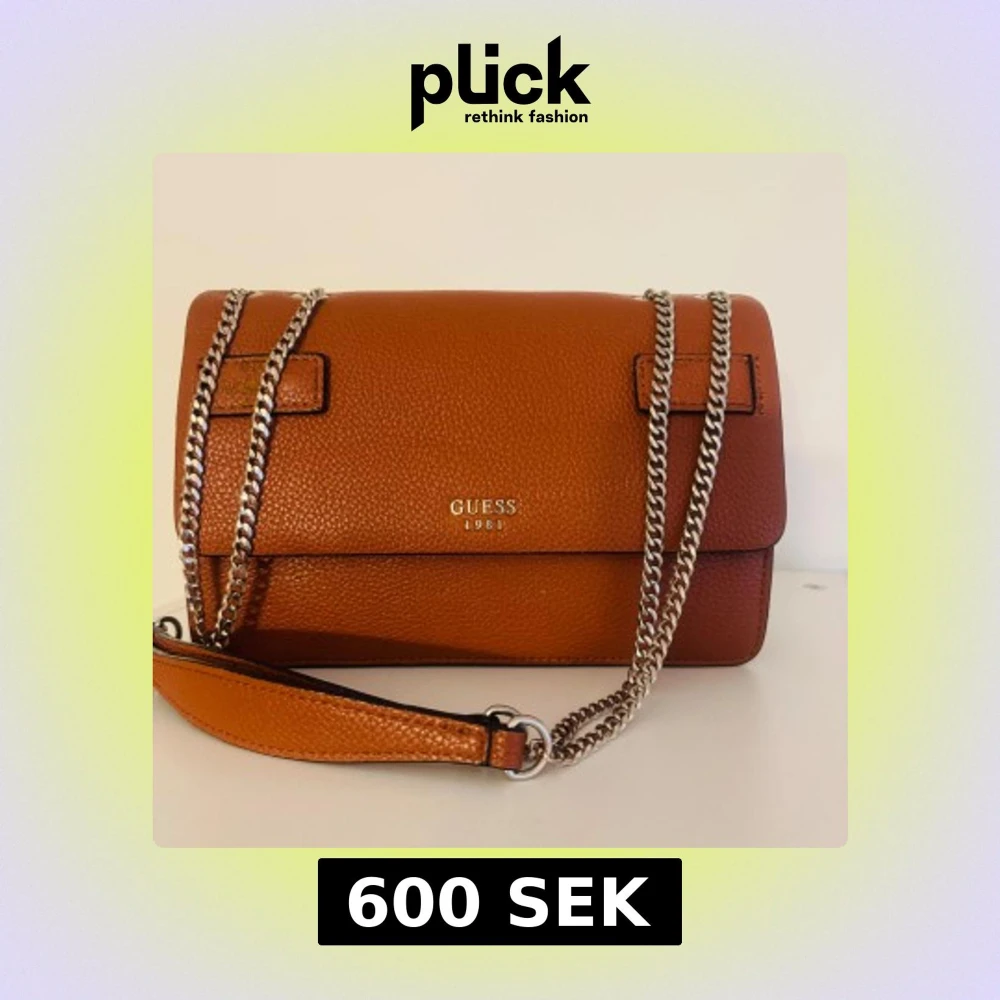 Säljer en snygg brun axelväska från Guess med kedjerem och stilren design. Väskan har en klassisk rektangulär form och är tillverkad i skinnliknande material med struktur. Perfekt för att lyfta din outfit med en trendig accessoar.
