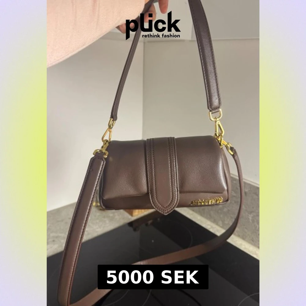 Säljer en brun axelväska från Jacquemus i äkta skinn med guldiga metalldetaljer och avtagbar axelrem. Väskan har en stilren, avlång form och stängs med lock. Jacquemus-logga i guld framtill. Dustbag medföljer.