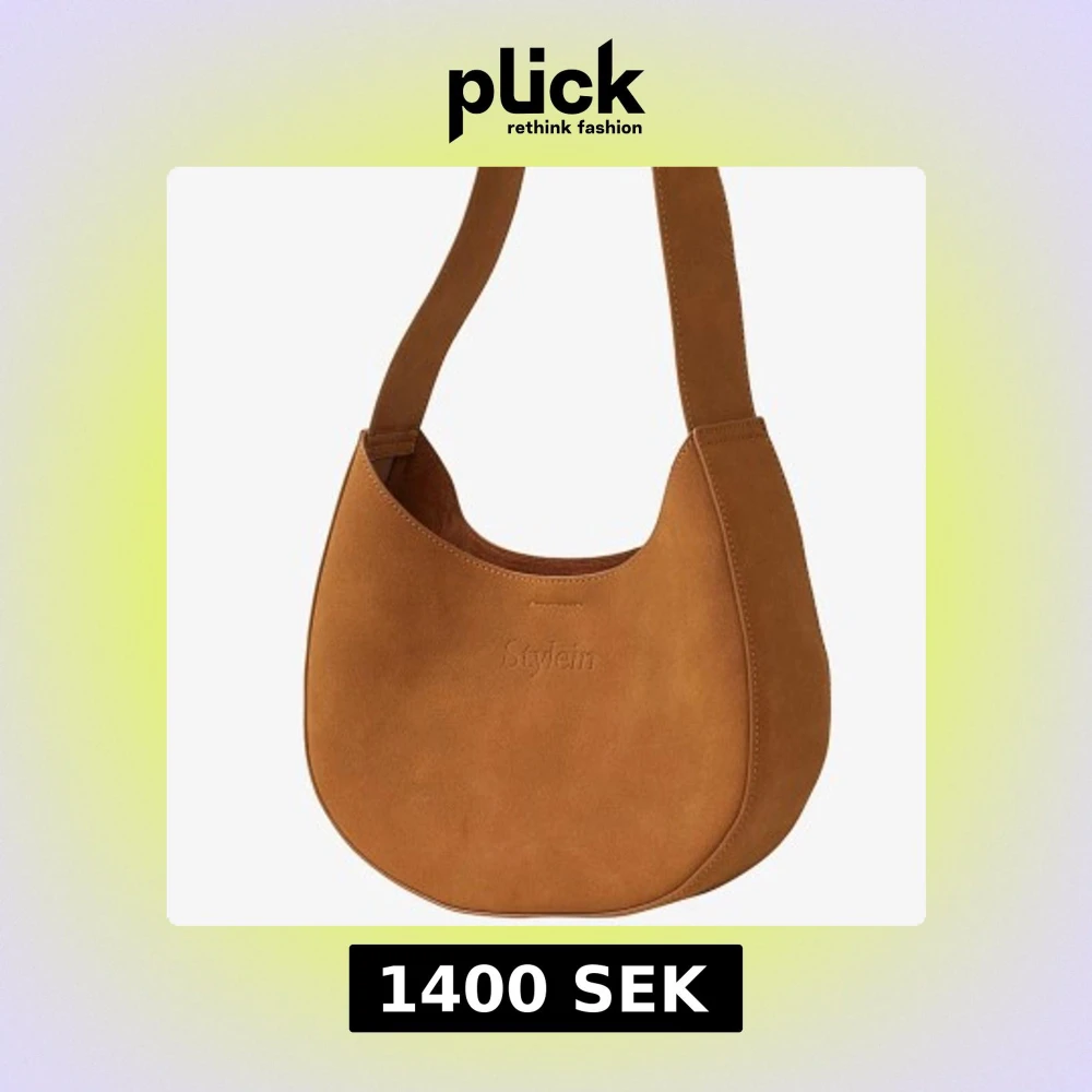 Snygg axelväska i rundad form från Stylein, tillverkad i mjuk brun mocka. Väskan har bred axelrem och minimalistisk design med diskret Stylein-logga framtill. Perfekt storlek för det viktigaste och ger en trendig touch till din outfit. Helt ny med prislapp kvar.
