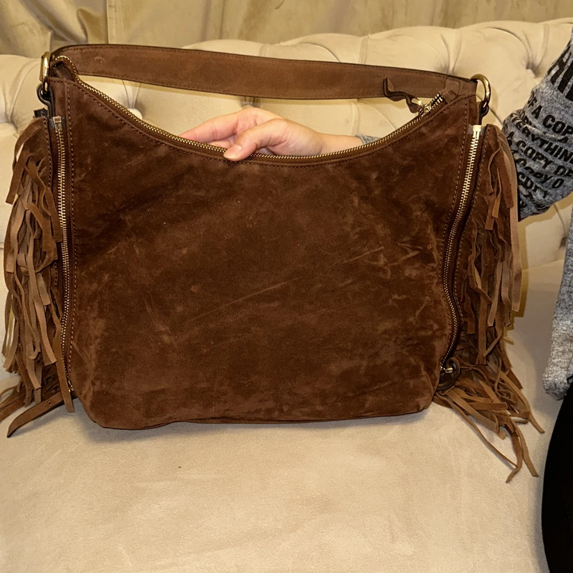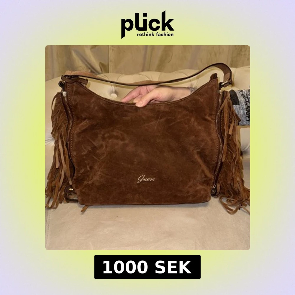 Snygg brun axelväska i mocka från Guess med fransar på sidorna. Väskan har en dragkedja upptill och ett ljust innerfoder med mönster. Perfekt för att ge en bohemisk touch till din outfit. Helt oanvänd! Det finns inte att köpa längre hos Guess