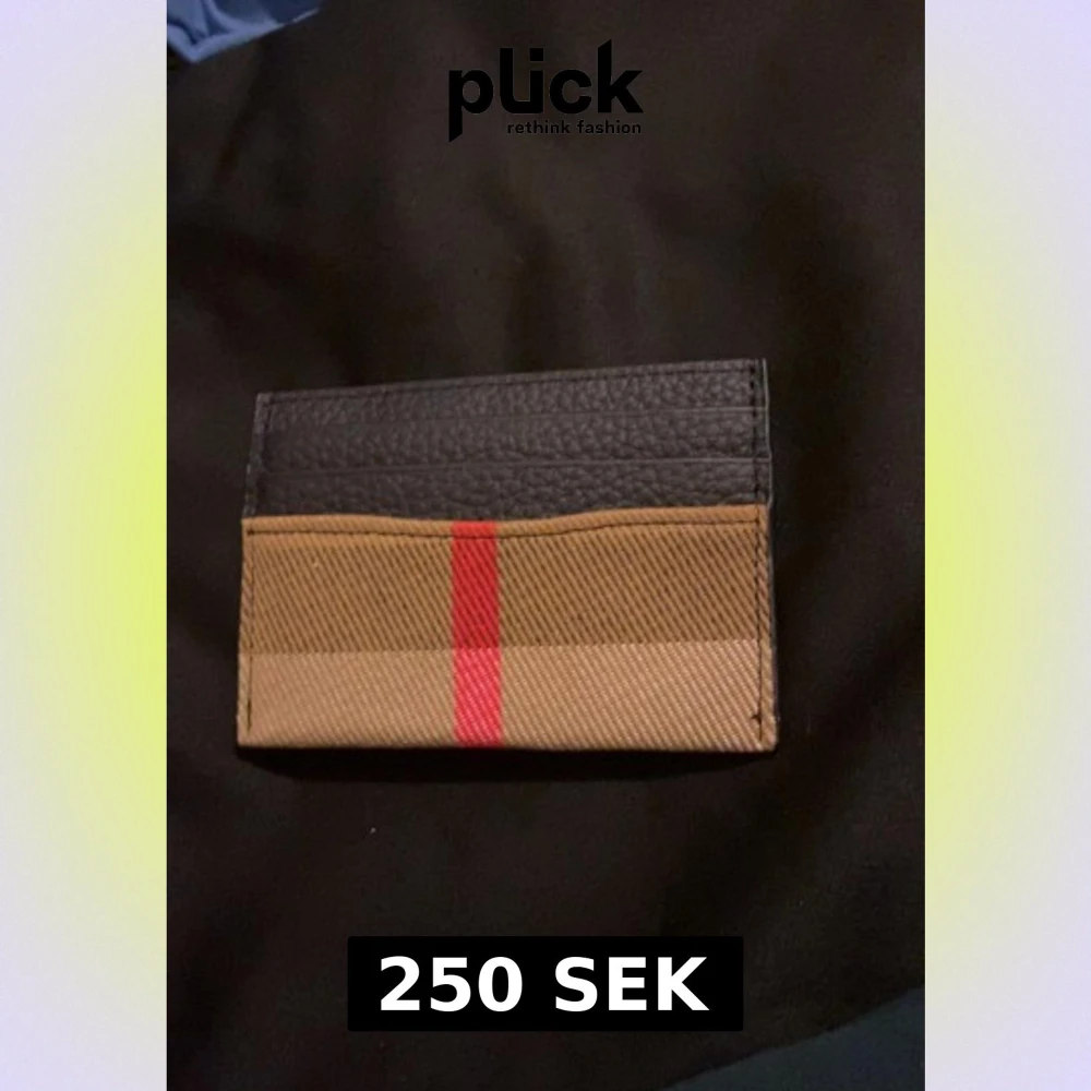 Snygg plånbok från Burberry med klassiskt rutig design i beige och brunt, samt en röd rand i mitten. Övre delen är i svart skinn med plats för kort. Perfekt för dig som vill ha en stilren och ikonisk accessoar i fickan.