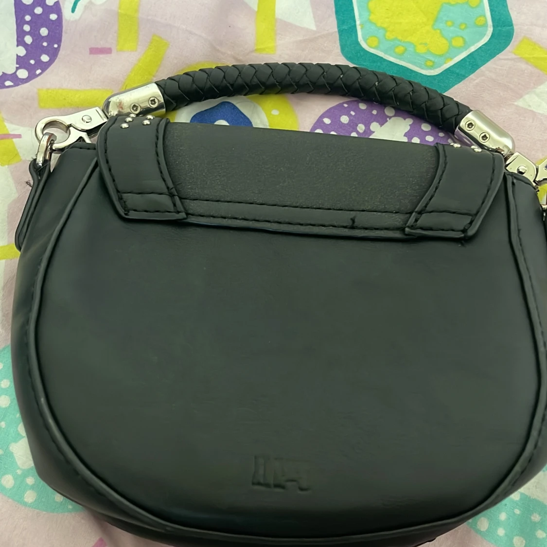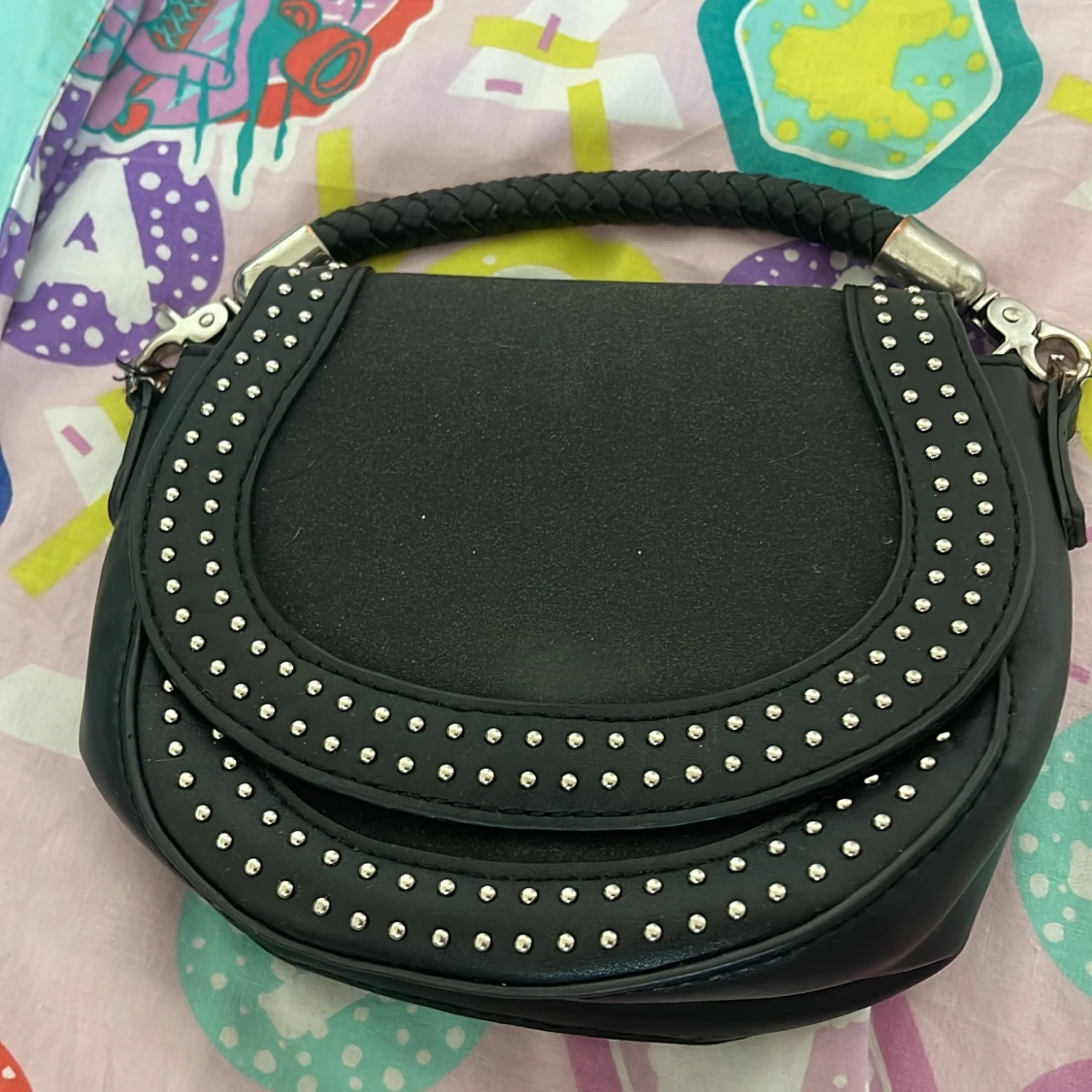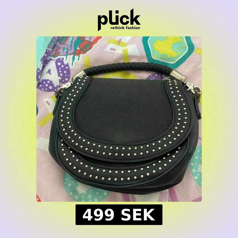 Snygg svart handväska från carin Wester med rundad form, dekorerad med silvriga nitar på framsidan och ett flätat handtag. Väskan är gjord i skinnimitation och har ett stilrent, trendigt uttryck. Perfekt för dig som vill ha en edgy accessoar till din outfit.