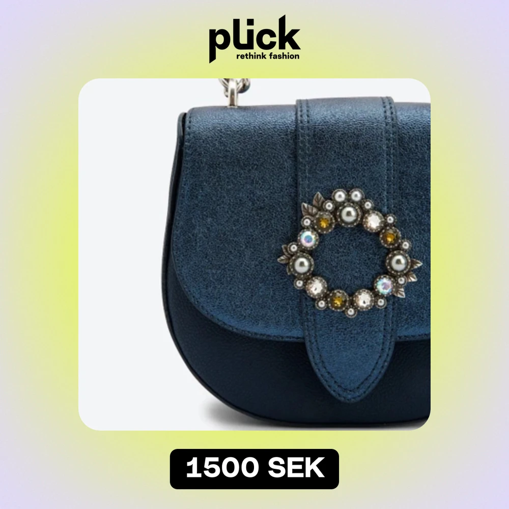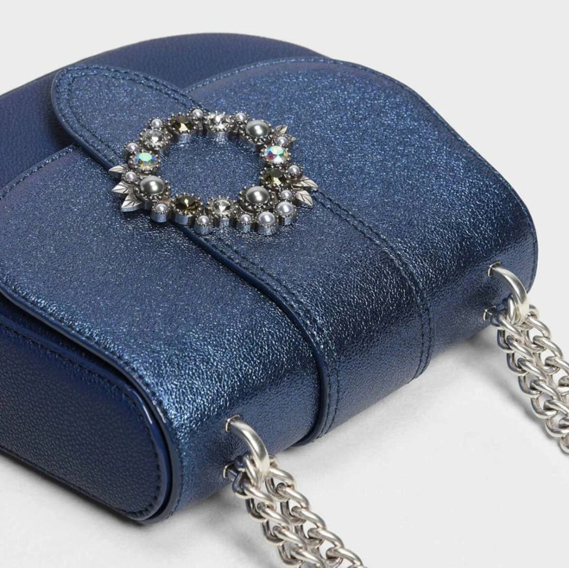 Skimmerblå Charles and Keith axelarmsväska i konstläder med stenar och silverkedja, helt ny i originalpåse