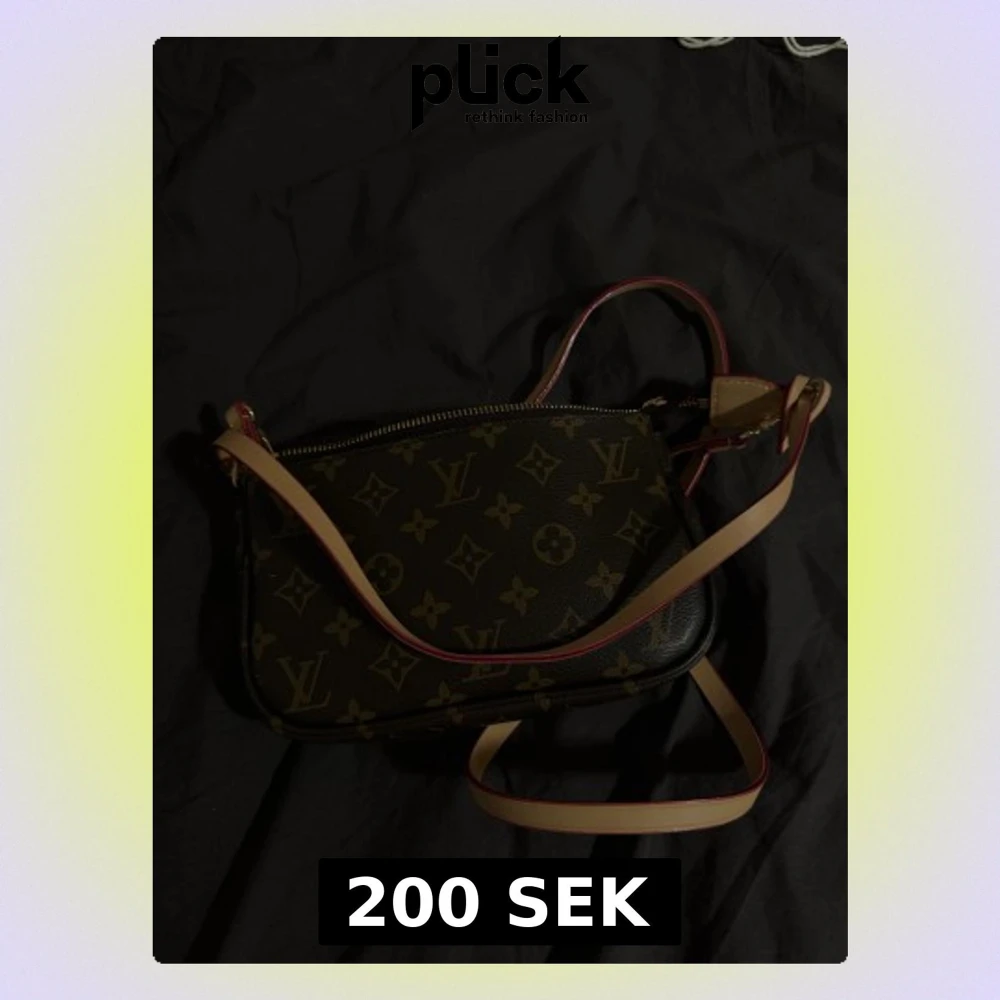 Snygg axelväska i klassiskt monogrammönster. Väskan är brun med beige och guldiga detaljer, har justerbar axelrem i ljust skinn och dragkedja upptill. Köpt i Spanien