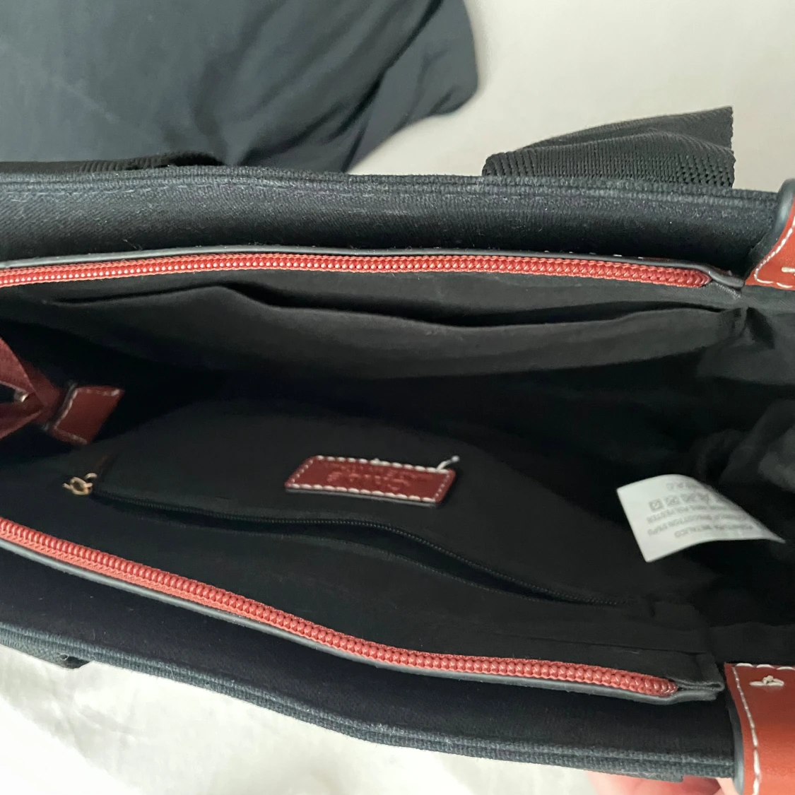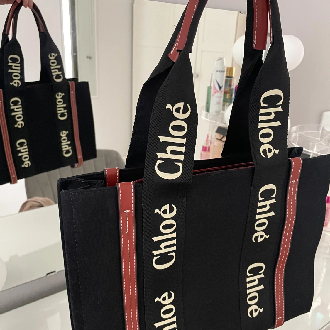 Snygg svart axelväska från Chloé med tydliga logoband i beige och svarta färger. Väskan har bruna detaljer med vita sömmar och är tillverkad i bomull och polyester. Rymlig insida med dragkedjefack och praktiska handtag. Perfekt för dig som gillar statement-accessoarer.