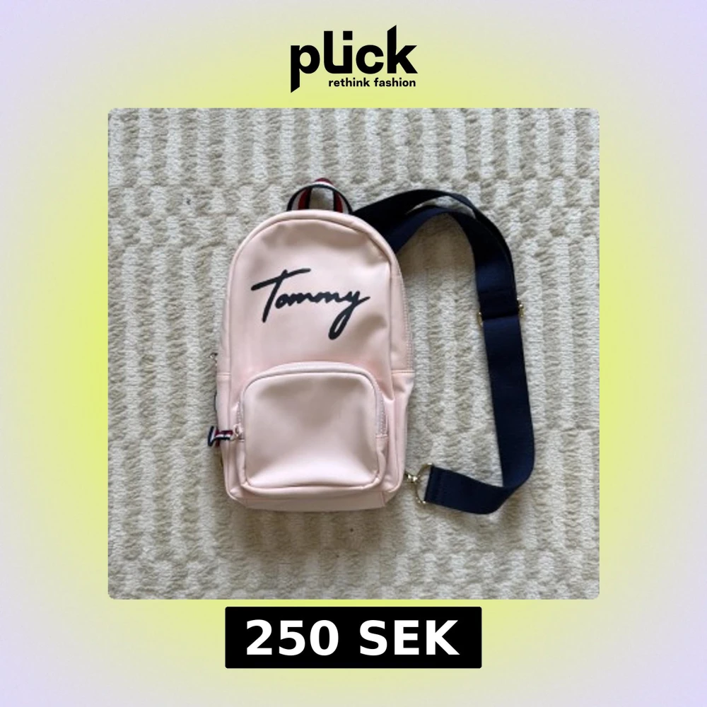 Snygg ljusrosa ryggsäck från Tommy Hilfiger med mörkblå logga framtill. Väskan har ett stort huvudfack, en mindre ficka med dragkedja framtill och marinblått innerfoder med röda detaljer. Justerbara axelband och guldfärgade metalldetaljer. Ett väldigt litet märke syns på framfickan (se bild), knappt märkbart!