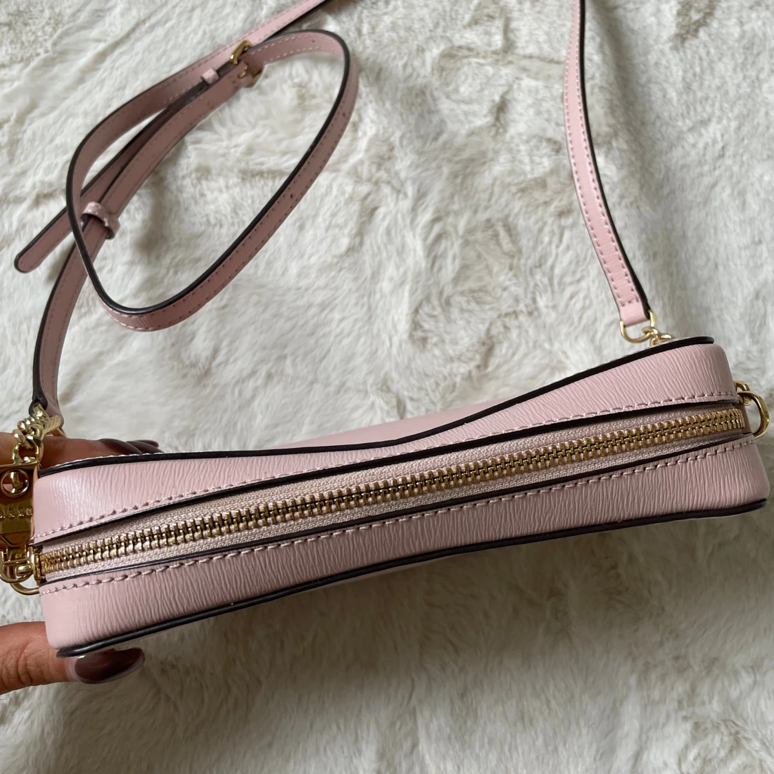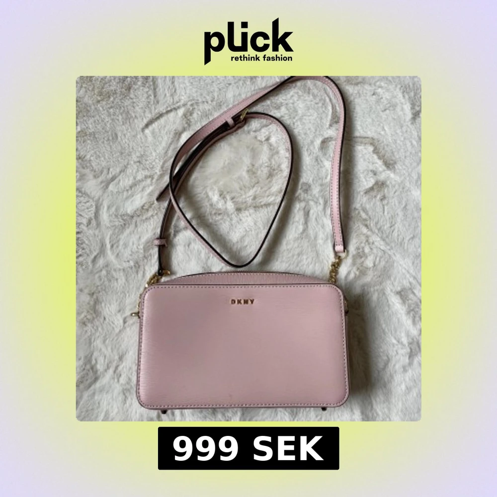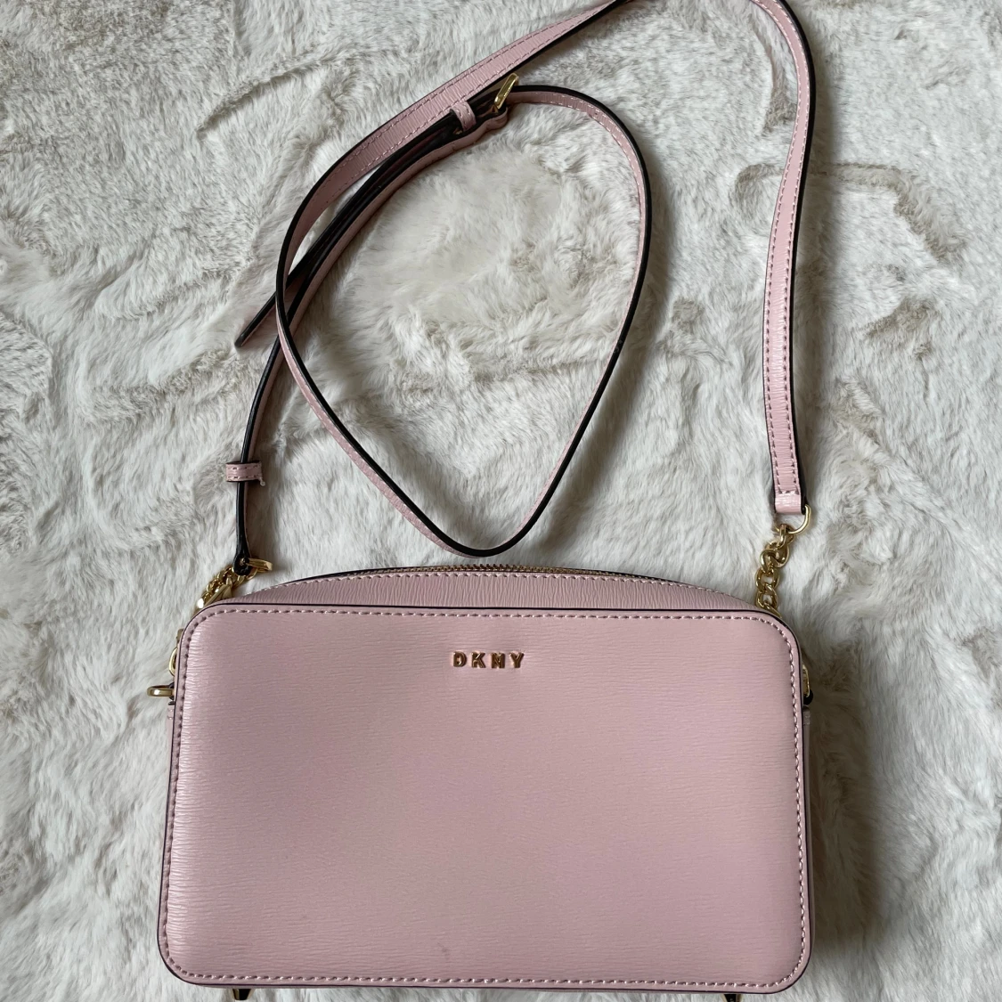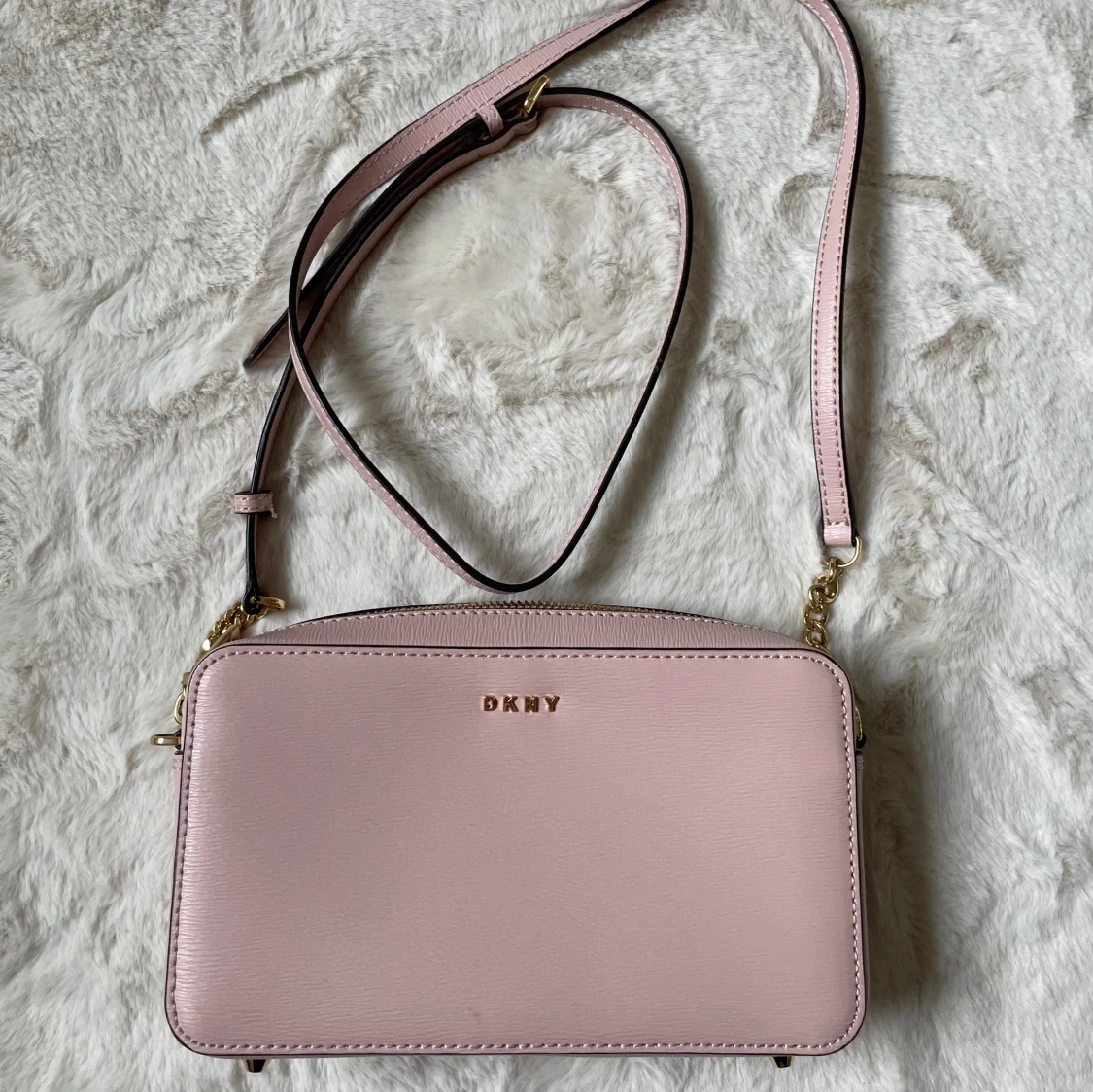 Snygg ljusrosa axelväska från DKNY med stilren, rektangulär form och guldfärgade detaljer. Väskan har justerbar axelrem och är tillverkad i slätt skinn. Perfekt storlek för mobil, plånbok och småsaker. DKNY-logga i guld framtill.