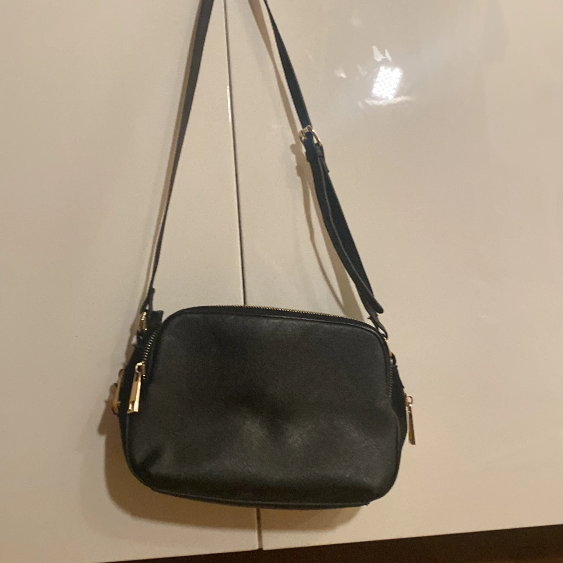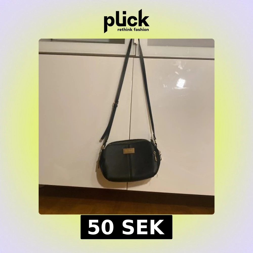 Säljer en stilren svart axelväska från Don Donna med justerbart axelband och guldfärgade detaljer. Väskan har dragkedja upptill och en enkel, klassisk design som passar till många outfits.