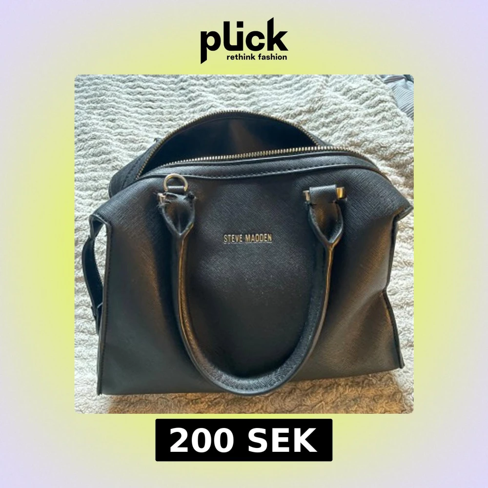 Snygg svart handväska från Steve Madden med stilren design och guldfärgad dragkedja. Väskan har två rejäla handtag, strukturerad yta och rymligt innerfack. Perfekt för dig som gillar klassisk look med en modern touch.