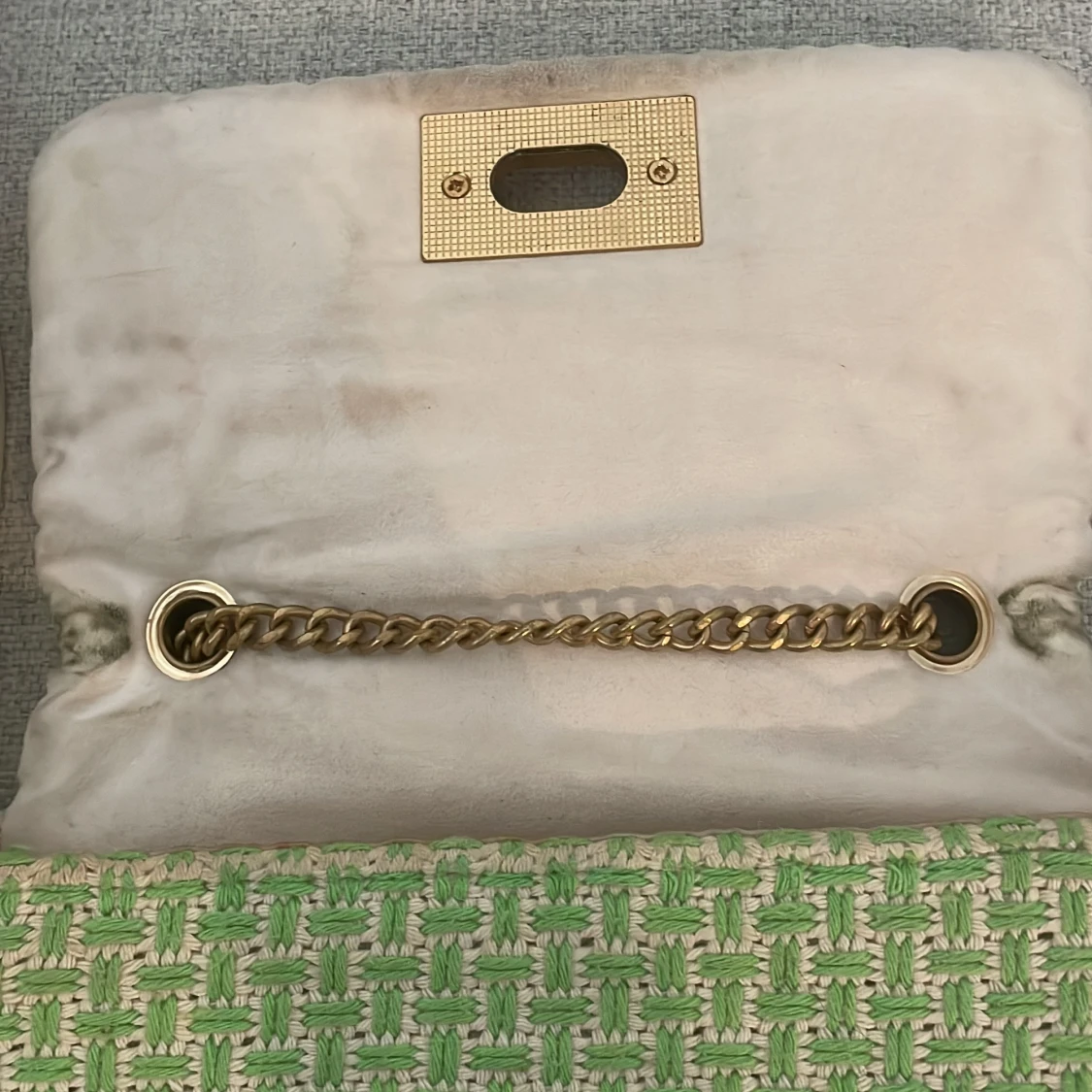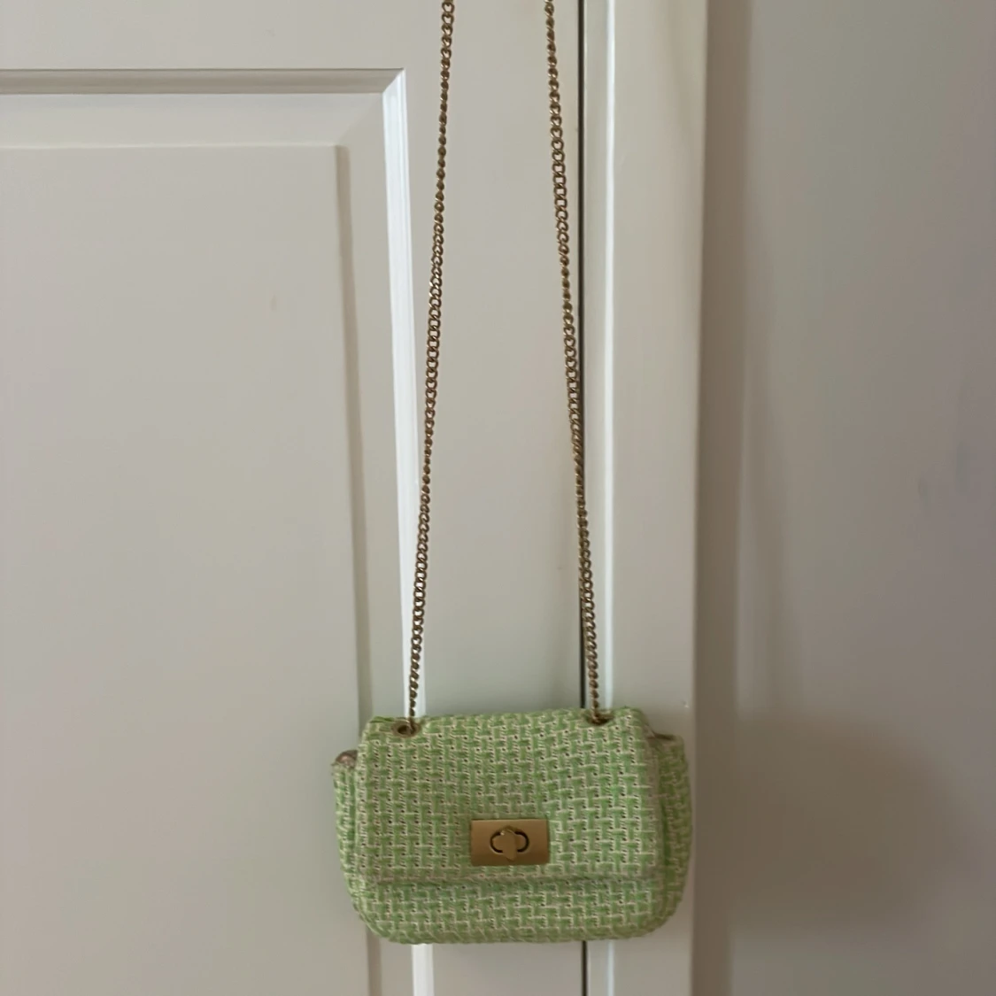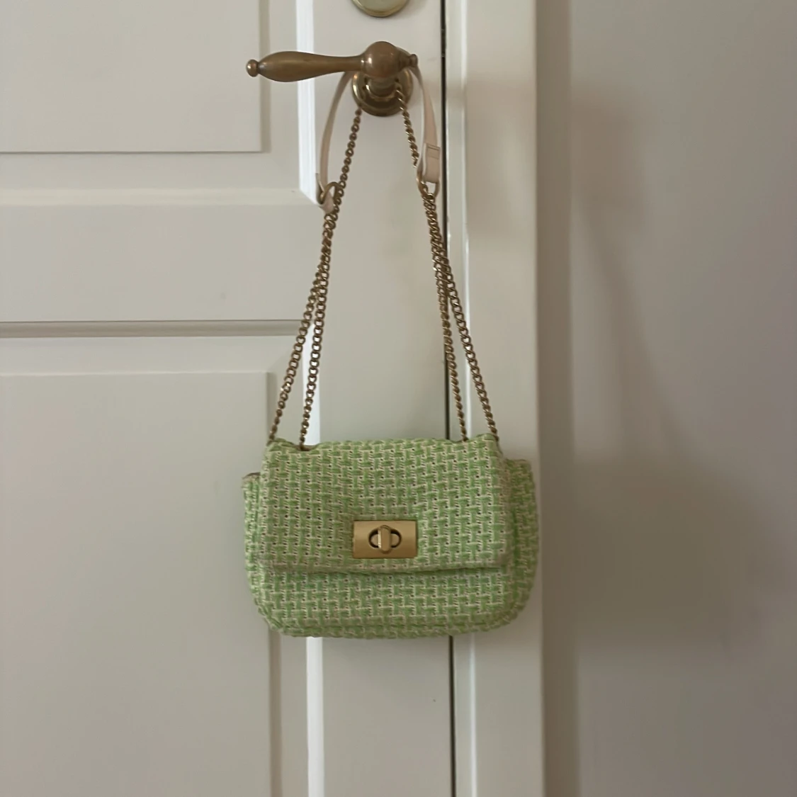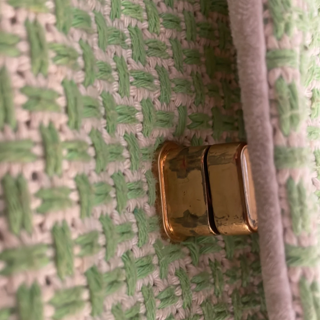Den är grön oc så där bra sik för den är lite miss färgad på insidan men syns inte på utsidan. Knappen är också lite miss färgad men vilket jag själv inte stör mig på. Kolla gärna in mina andra saker vilket jag säljer biligt för jag vill bli av snapt