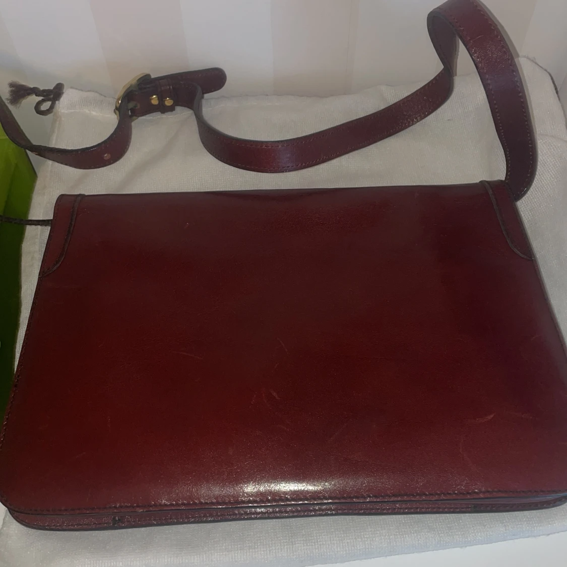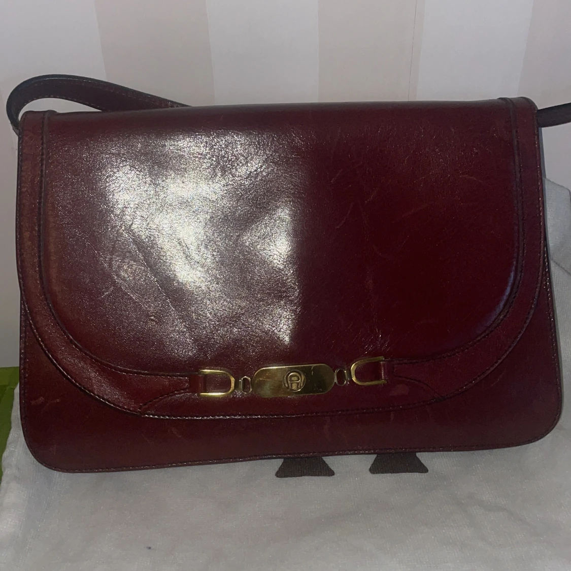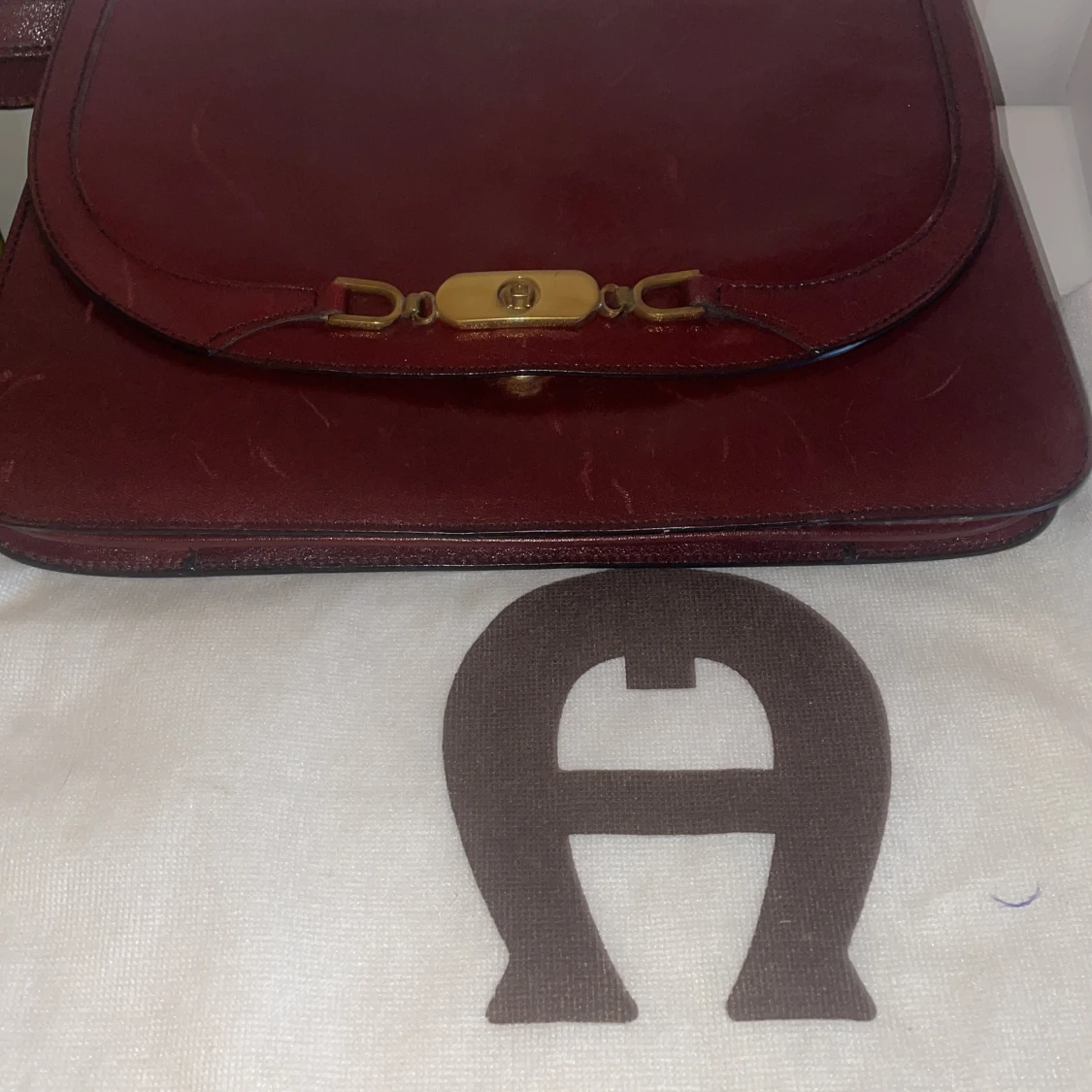Snygg vinröd axelväska i skinn från Etienne Aigner med guldfärgade detaljer. Väskan har en elegant design med ett spänne framtill och en justerbar axelrem. Perfekt för att ge en touch av stil till din outfit.
