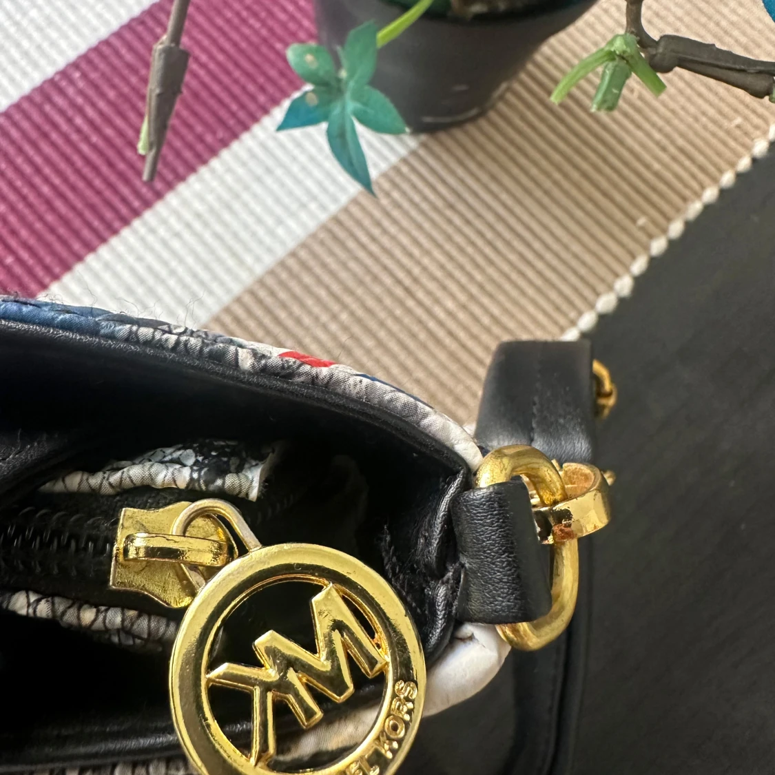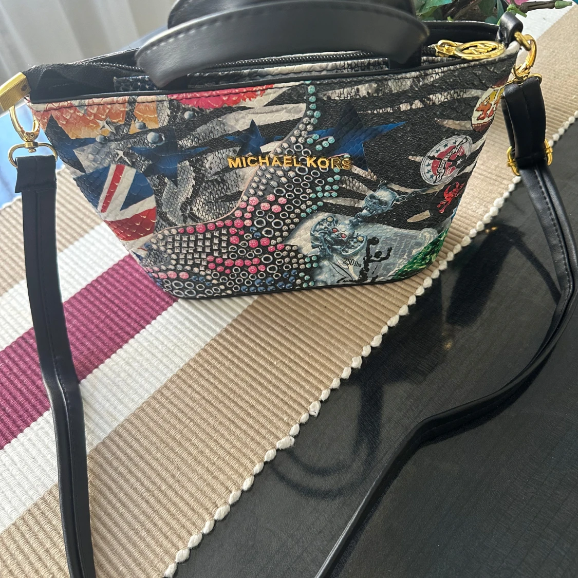 Säljer en supercool och färgglad axelväska från Michael Kors. Väskan har ett unikt mönster med olika färger och detaljer, perfekt för att liva upp vilken outfit som helst. Den har en dragkedja upptill och en justerbar axelrem. Perfekt för både vardag och fest!