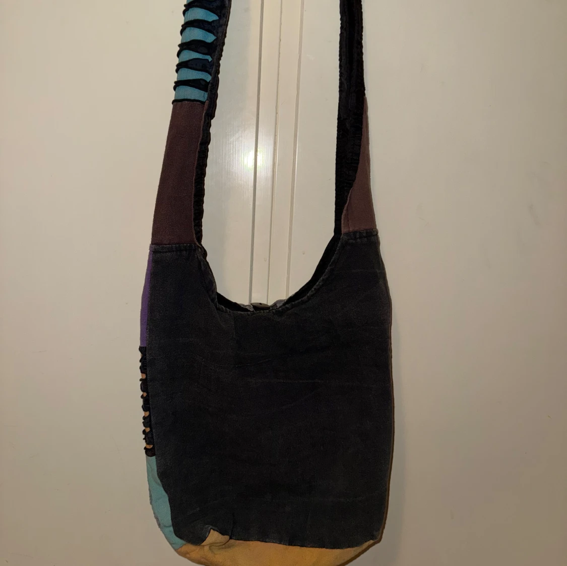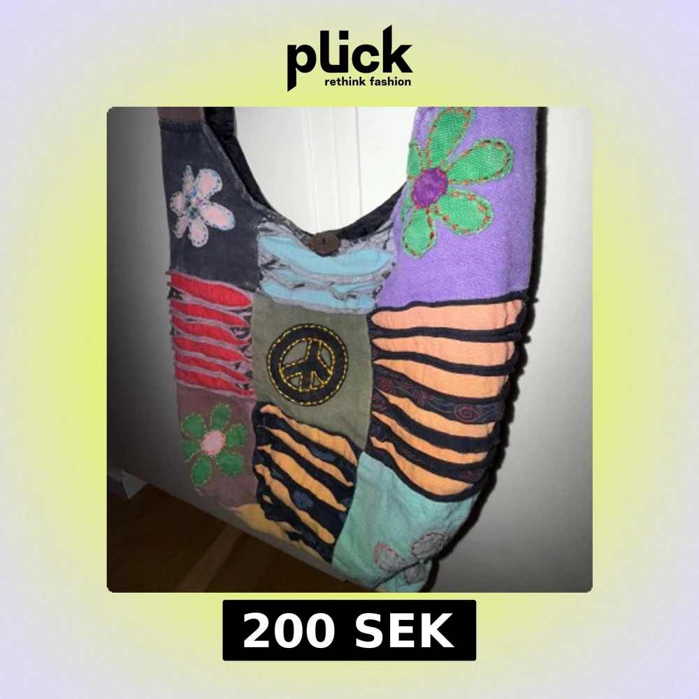 Unik axelväska i patchwork-stil med färgglada ränder och applikationer av blommor och en fredssymbol. Väskan har en knappstängning och är perfekt för en bohemisk look. Är i bra skick! Tar bara emot Swish! Så köp inte direkt och fråga gärna mig om ni undrar något! Skickar postbevis! Frakt: 65kr