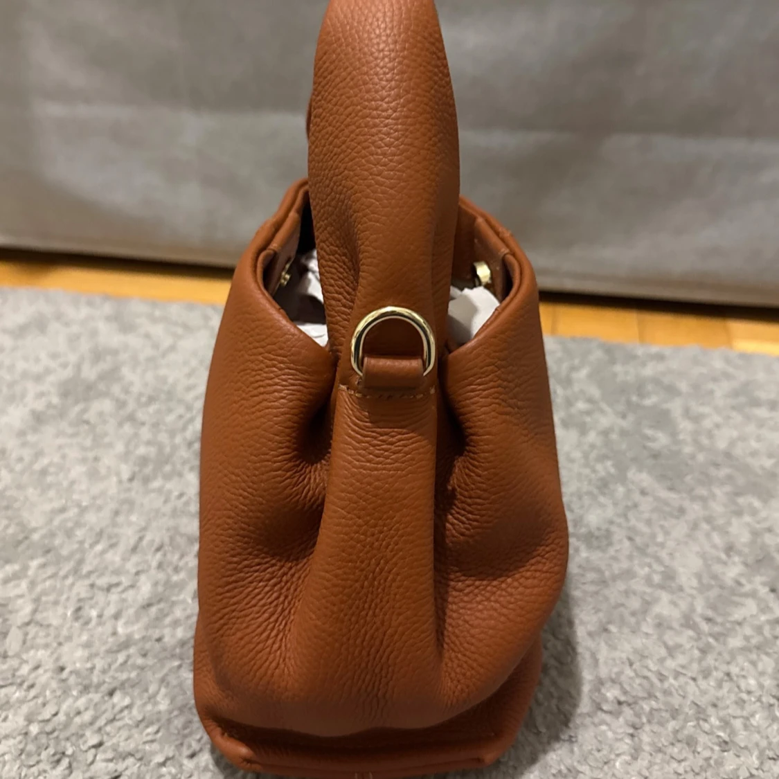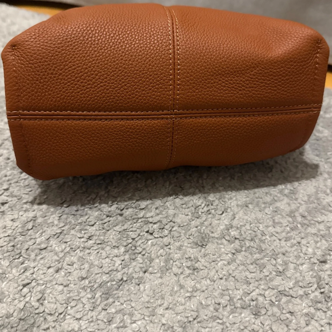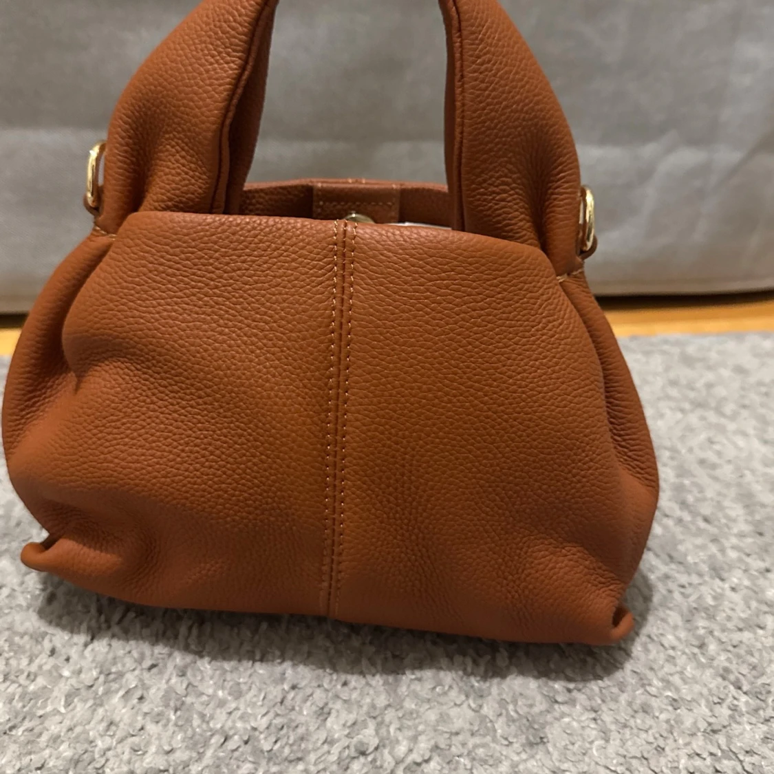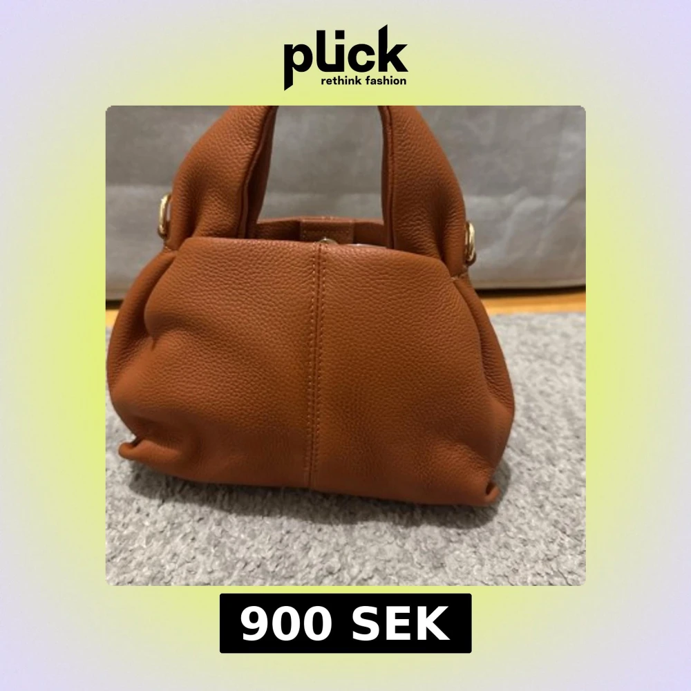 Snygg brun handväska från Raffinato i mjukt, strukturerat skinn. Väskan har en stilren, boxig form med korta handtag och guldfärgade metalldetaljer. Stängs med magnetknapp och har ett ljust innerfoder. Perfekt för dig som gillar klassisk och trendig stil. Aldrig använd