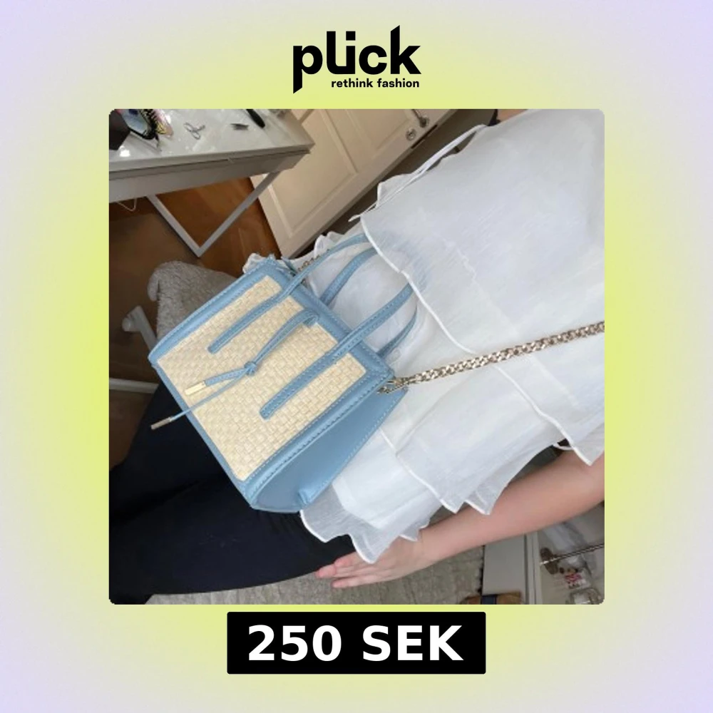 Snygg axelväska i blått och beige med flätad design. Väskan har en elegant kedjerem och dragkedja upptill. Perfekt för att ge din outfit en stilfull touch.