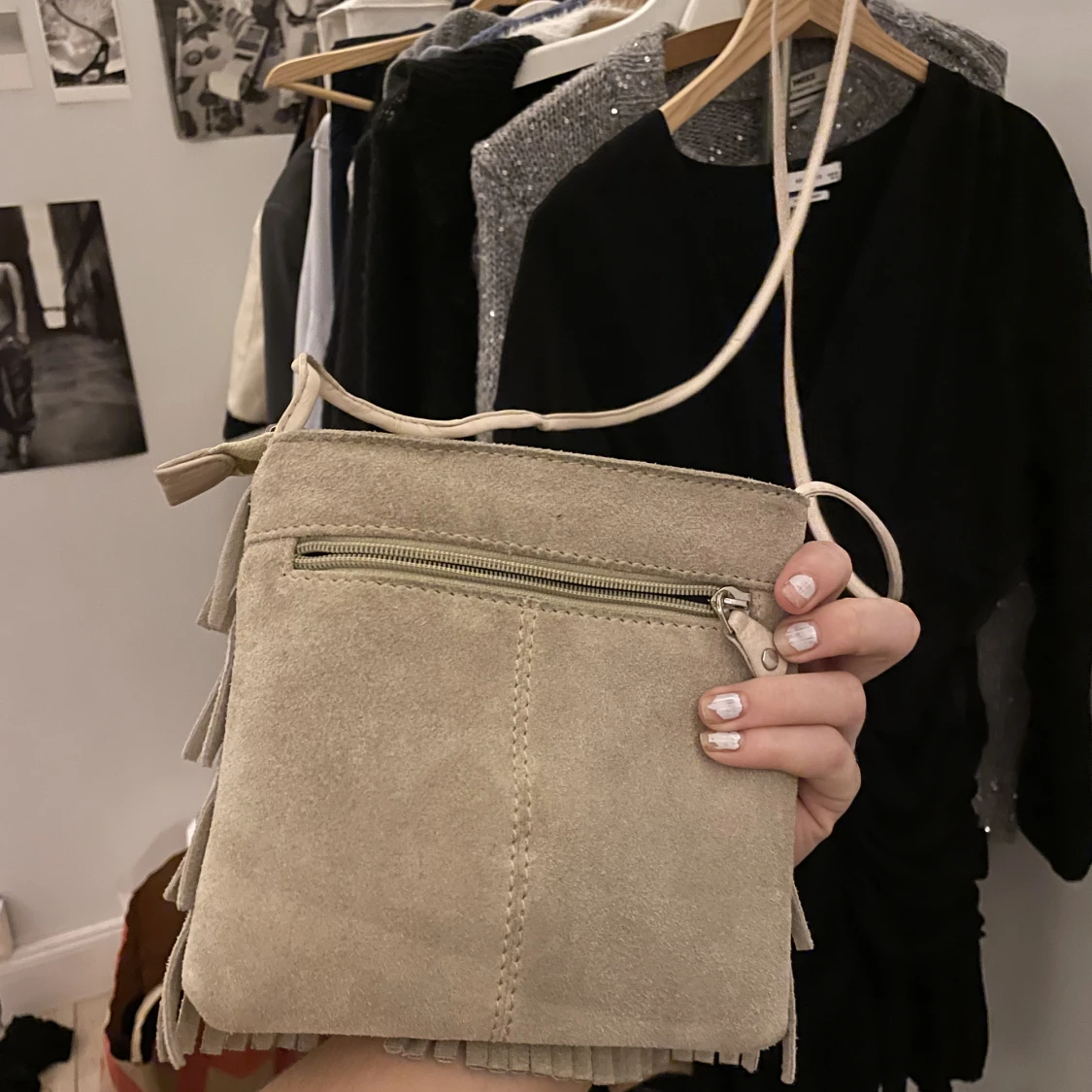 Köpt av en kvinna från Härjedalen som gör olika saker i mocka och säljer i sin butik där<3 säljer för den inte kommit till användning tyvärr. OBS väskans band är väldigt långt och går ej att justera. De gångerna jag använde väskan knöt jag upp det:)