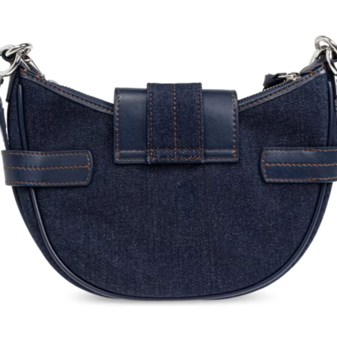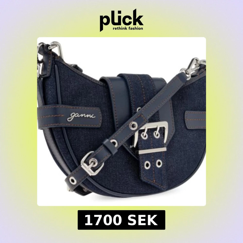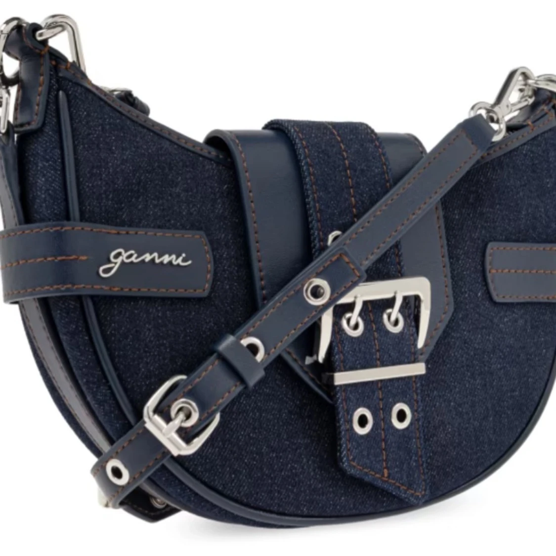 Snygg blå axelväska från Ganni i jeansmaterial med läderdetaljer. Väskan har en justerbar axelrem och ett spänne framtill som ger en cool look. Perfekt för att ge din outfit en trendig touch.