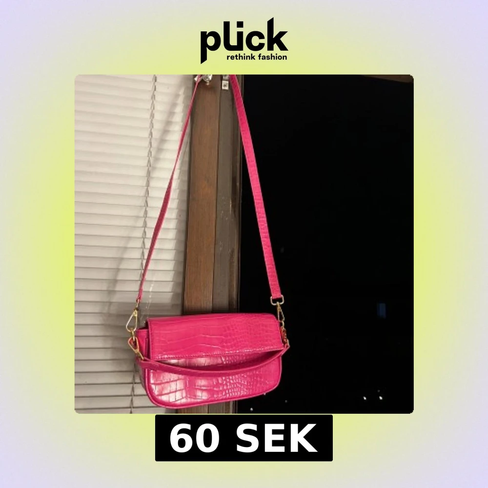 Säljer en snygg axelväska i starkt rosa färg med croco-mönstrad yta och guldfärgade metalldetaljer. Väskan har både axelrem och handtag, perfekt för att lyfta vilken outfit som helst. Materialet är glansigt syntet och väskan har en stilren, rektangulär form.