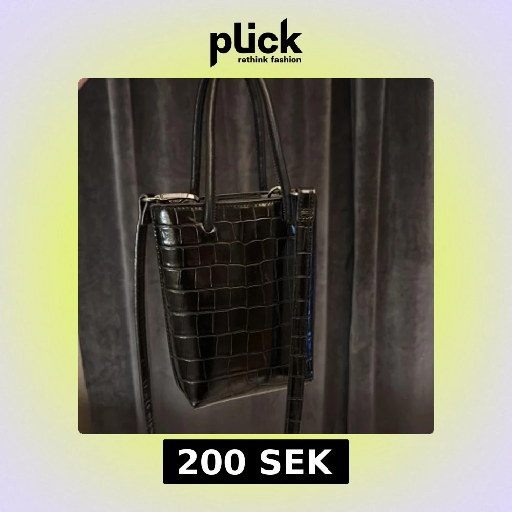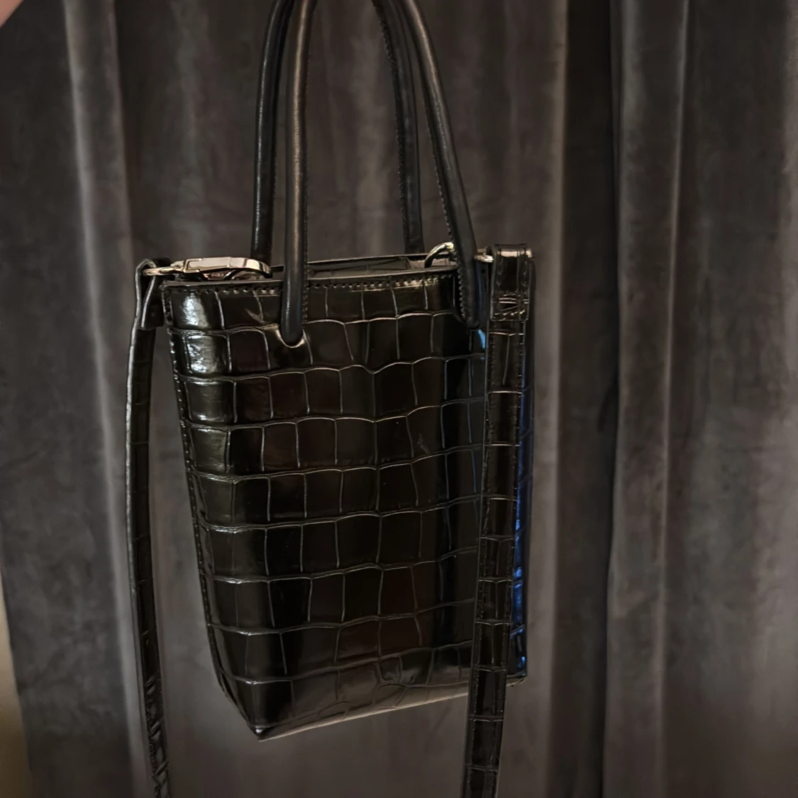 Säljer en svart axelväska med croco-mönstrad yta och stilrena silverdetaljer. Väskan har både handtag och lång axelrem, perfekt för att bära på olika sätt. Den är rektangulär och har en glansig finish som ger en lyxig känsla. Perfekt accessoar för att lyfta din outfit.