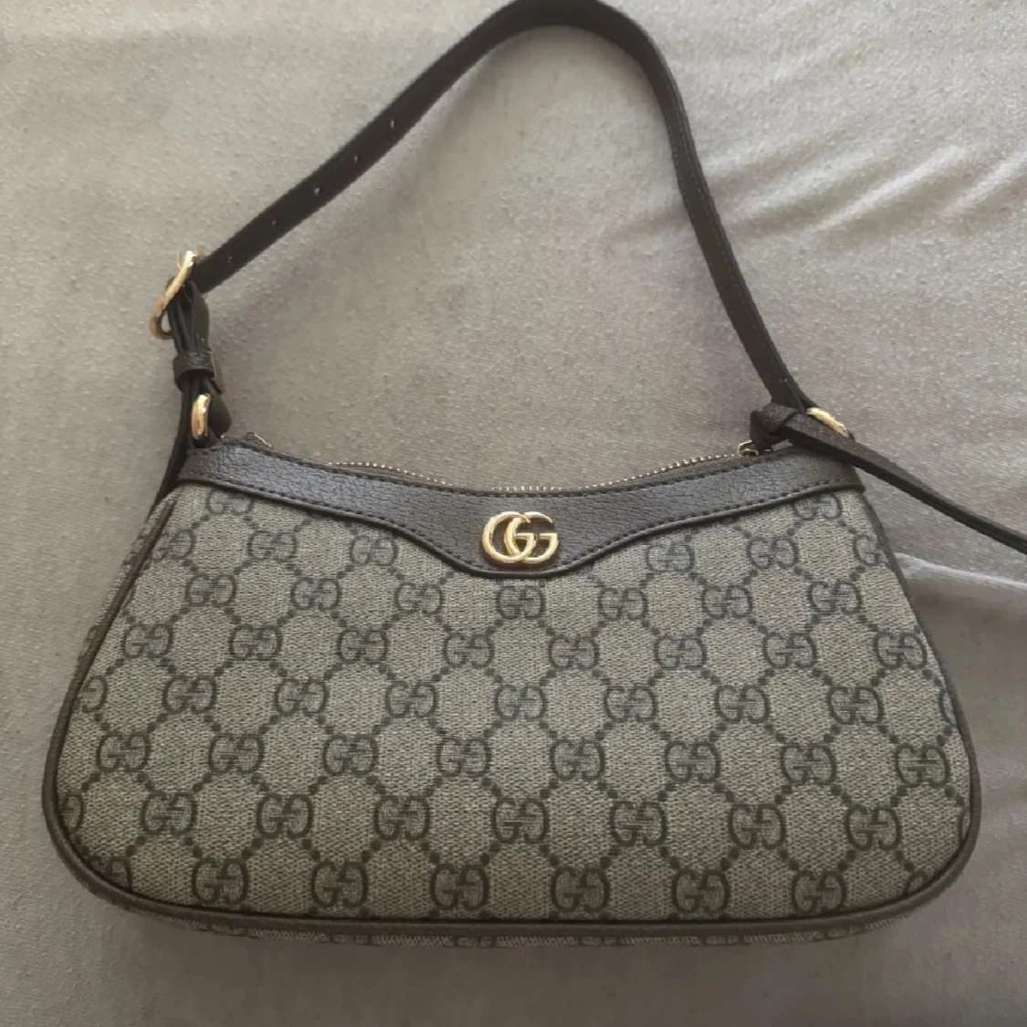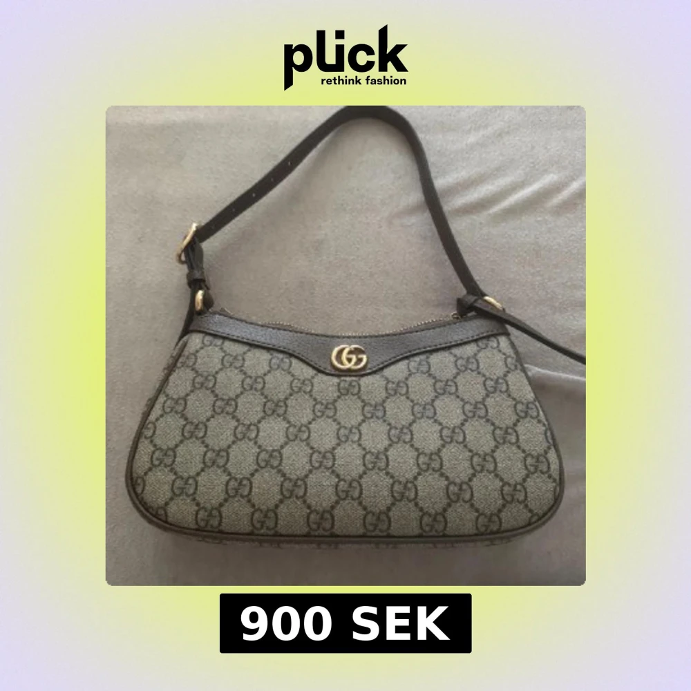 Snygg axelväska med klassiskt GG-mönster i grått och svart. Väskan har guldfärgad logodetalj, justerbar axelrem och dragkedja upptill. Perfekt storlek för det viktigaste och en ikonisk design som sticker ut.