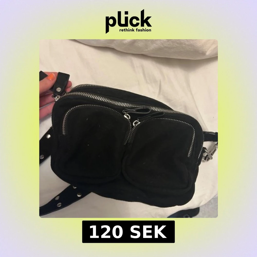 Snygg svart axelväska med två dragkedjeförsedda fickor framtill och en justerbar axelrem dekorerad med nitar. Kommer tyvärr inte till användning längre, mycket bra skick!
