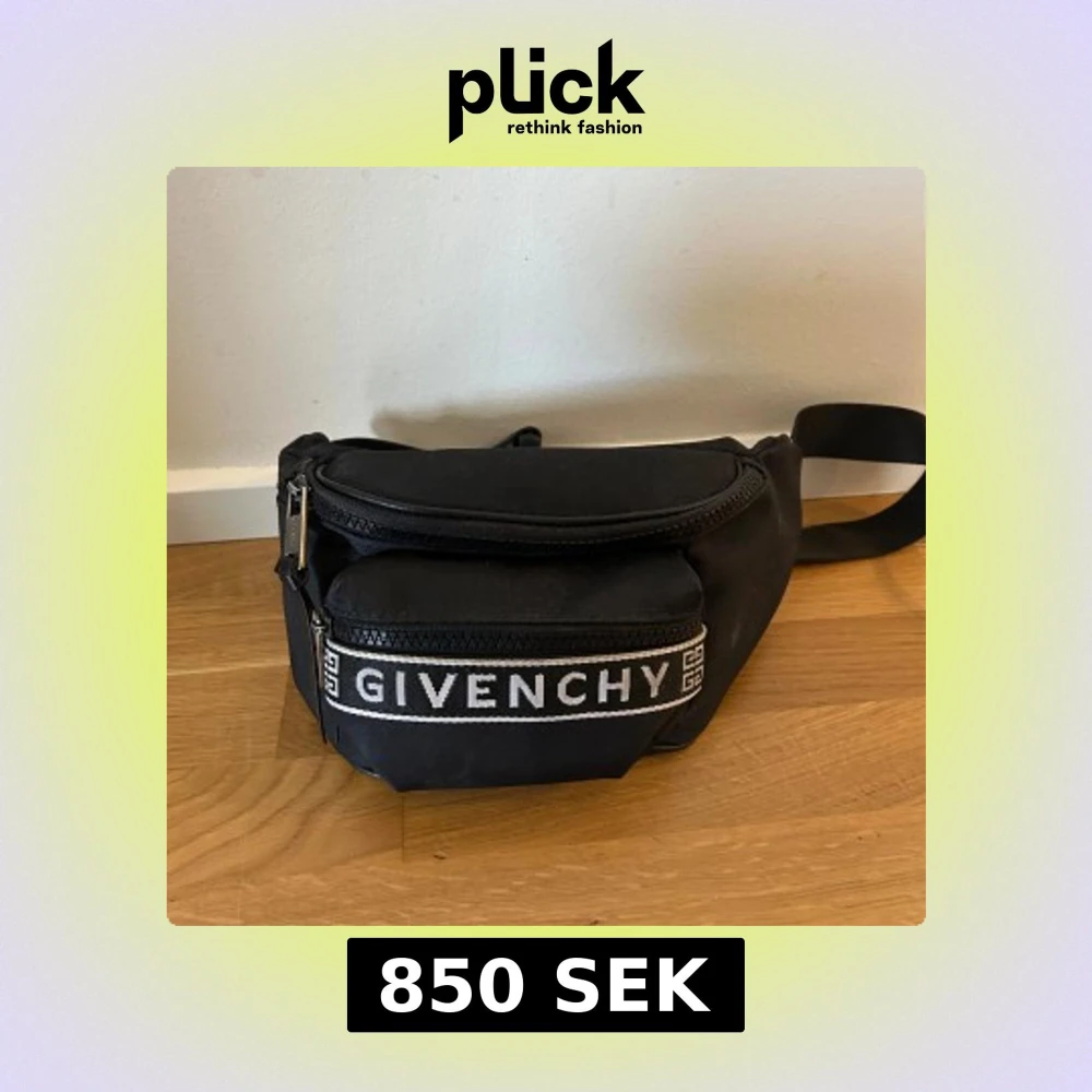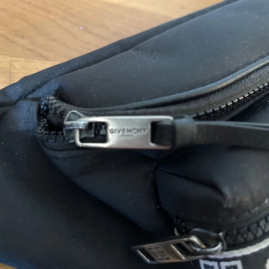 Snygg svart magväska från Givenchy med tydlig logga framtill. Väskan har två fack med dragkedja och justerbart band. Tillverkad i slitstark polyester och perfekt för att bära det viktigaste. Stilren och sportig design som passar till många outfits.