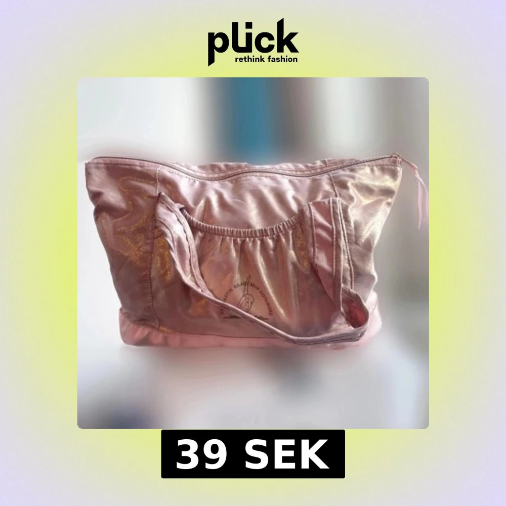 Stor glittrig rosa väska med dragkedja och dubbla handtag. Framsidan har en elastisk ficka med tryck. Perfekt för att bära med sig allt man behöver.
